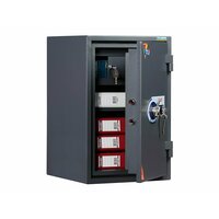 Предназначен для сохранности документов и ценностей при пожаре и взломе. Рекомендованная сумма хранения денег до1 млн. руб. для физических лиц. Устойчивость к взлому по ГОСТ Р 50862-2017: класс 1 (ГОСТ Р). Огнестойкость по ГОСТ Р 57384-2017: класс 60Б (ГОСТ Р). при заливке двери и корпуса сейфа используется огнестойкий бетон 3-х сторонняя усиленная ригельная система запирания защита замка и ригелей от высверливания и выбивания система блокировки ригельного механизма при выбивании замка тепловой замок, усиленный огнестойким уплотнителем общая толщина двери - 92 мм; толщина боковых стенок - 56 мм комплектуются ключевым замком KABA MAUER наличие анкерного крепления к полу (2 отверстия), анкерные болты в комплект не входят под заказ возможна установка биометрического кодового замка PS610FD/E36FD