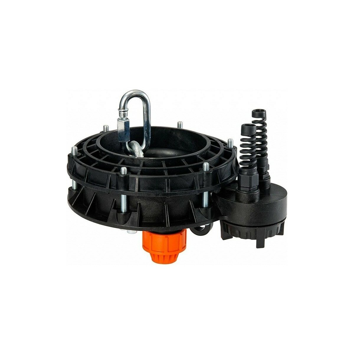 Оголовок скважинный Джилекс ОСПБ 110-133/25 оснащен стальными рым-болтами, которые позволяют погружать насос в скважину и извлекать его лебедкой или краном. Карабин на нижней поверхности оголовка обеспечивает надежное закрепление троса с насосом к корпусу оголовка.