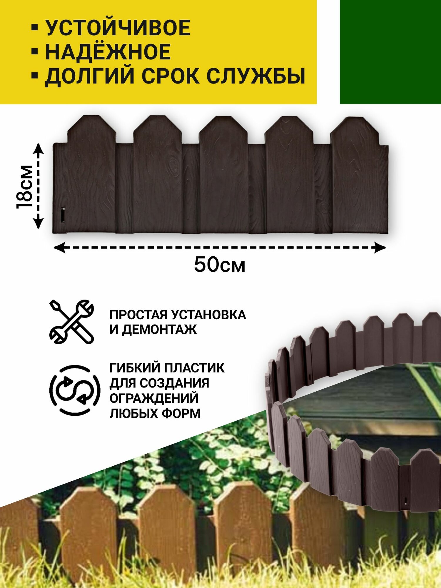 Ограждение «Дачник» поможет изысканно оформить цветочную клумбу или оградить грядки, придавая садовому участку более аккуратный вид. Пластиковый забор быстро и надежно крепится в почве с помощью специальных металлических штырей. Предмет изготовлен из высококачественного пластика, который очень удобен в эксплуатации: не разрушается от повышенной влажности, обладает атмосферной стойкостью и легко моется.