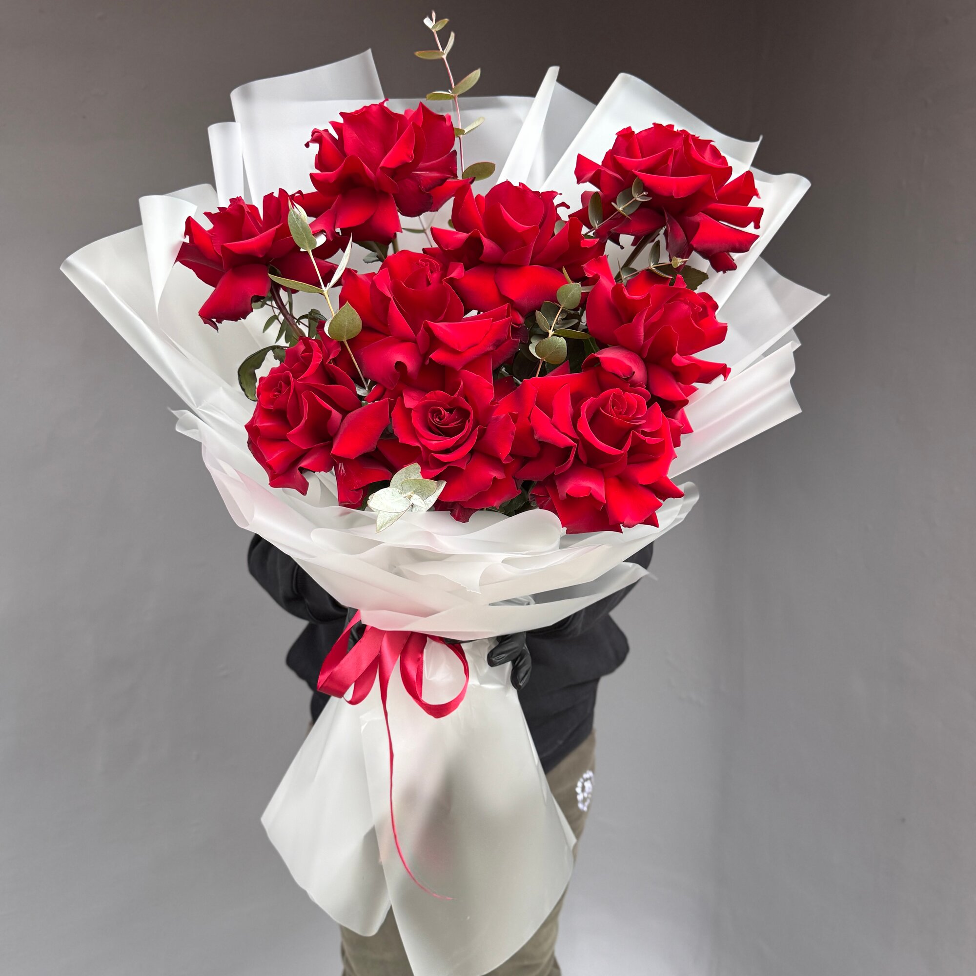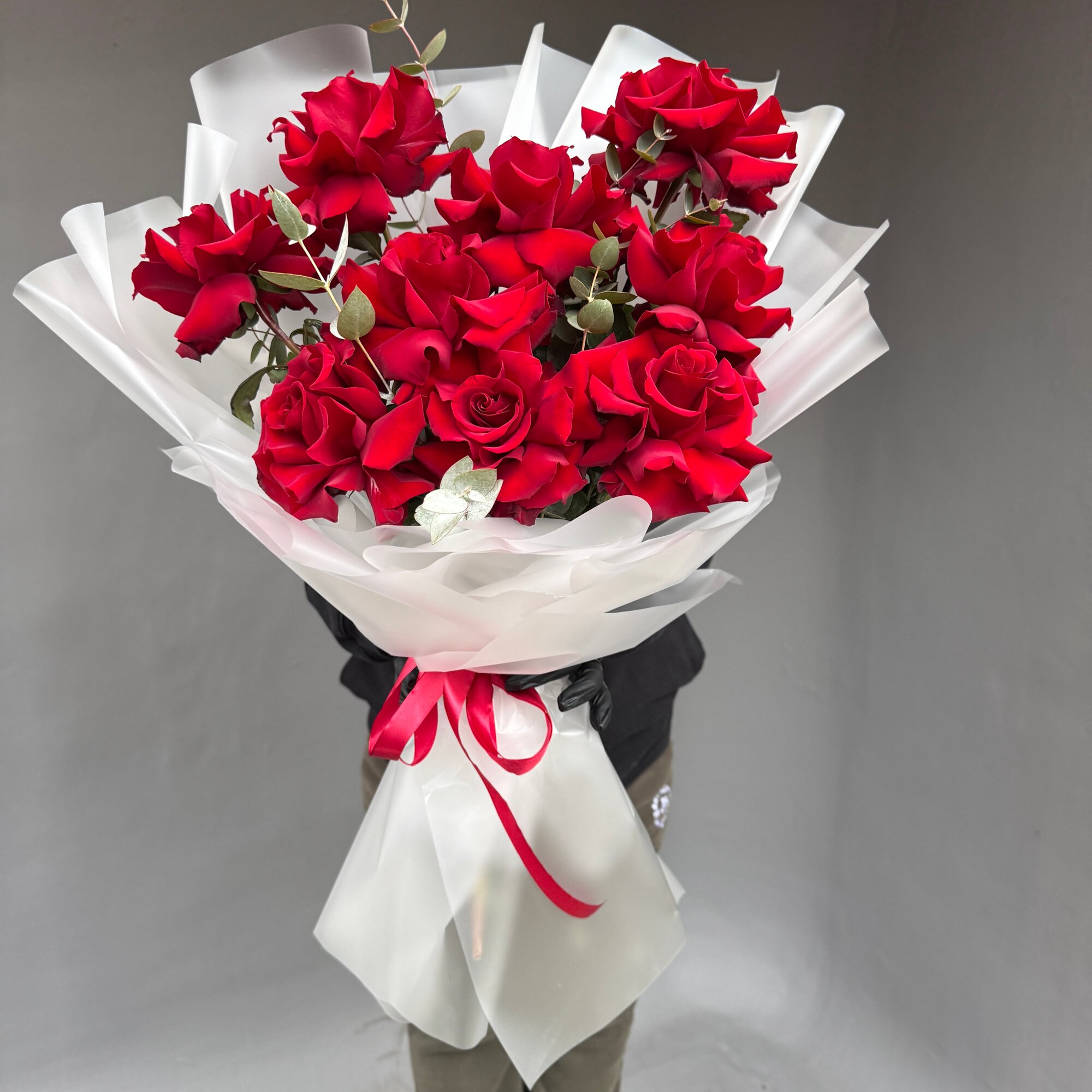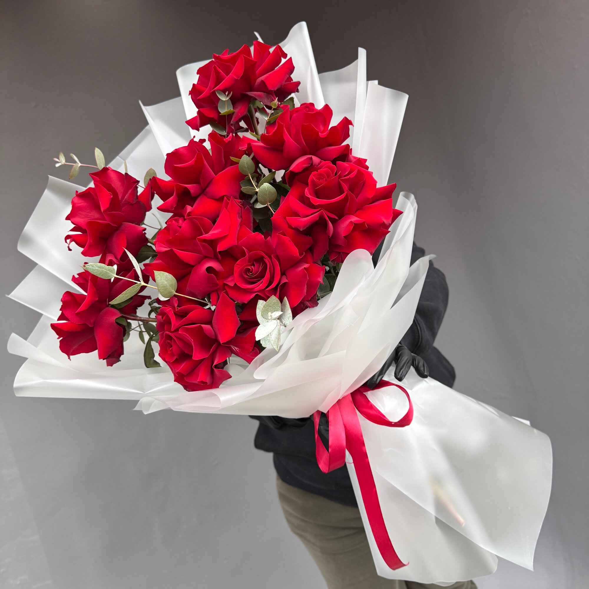 Купить Огромные 11шт (на фото 10шт) Французские розы красные букет экс арт.13865 с доставкой по всей России.