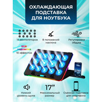 На торце подставки расположены расширенные световые полосы RGB. После того, подставка с охлаждением включена, она может распространять прохладный световой эффект RGB. Он содержит 10 видов освещения с особыми эффектами. Вы можете выбрать 5 динамичных режимов - быстрая волна, медленная волна, градиент цветов, дыхание со сменой цветов и разноцветная гирлянда, а также стичные режимы - синий, розовый, зеленый, бирюзовый и красный. Подсветку можно выключать и включать - для этого необходимо нажать и удерживать 3 сек кнопку RGB режимов.