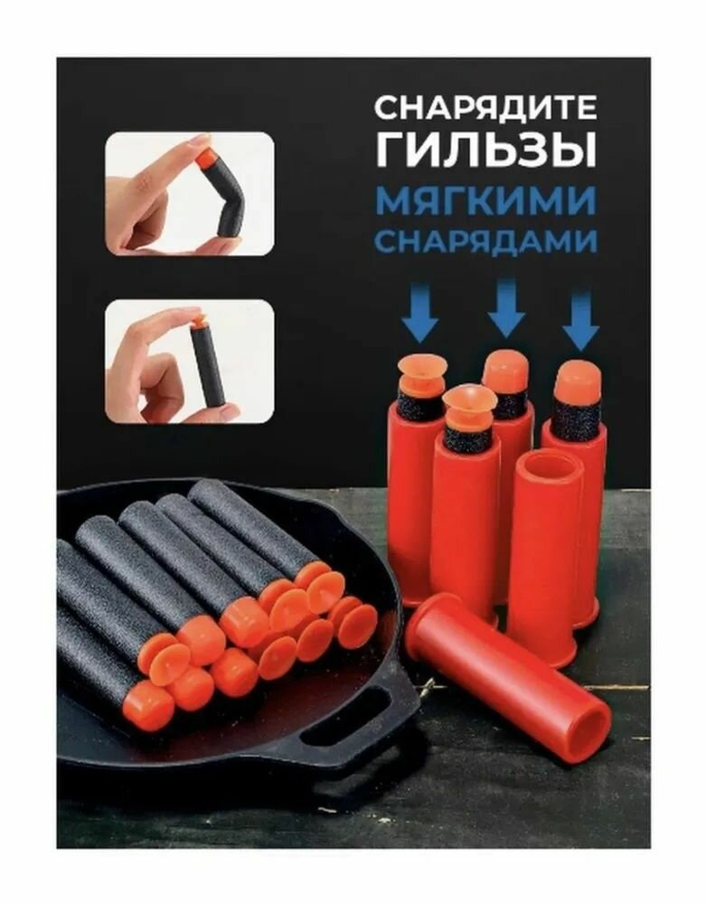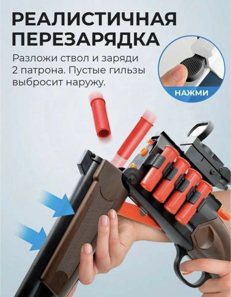 Дробовик выполняет эффектный выброс гильз после перезарядки, что доставляет детям и взрослым максимальный восторг и напоминает настоящий дробовик.