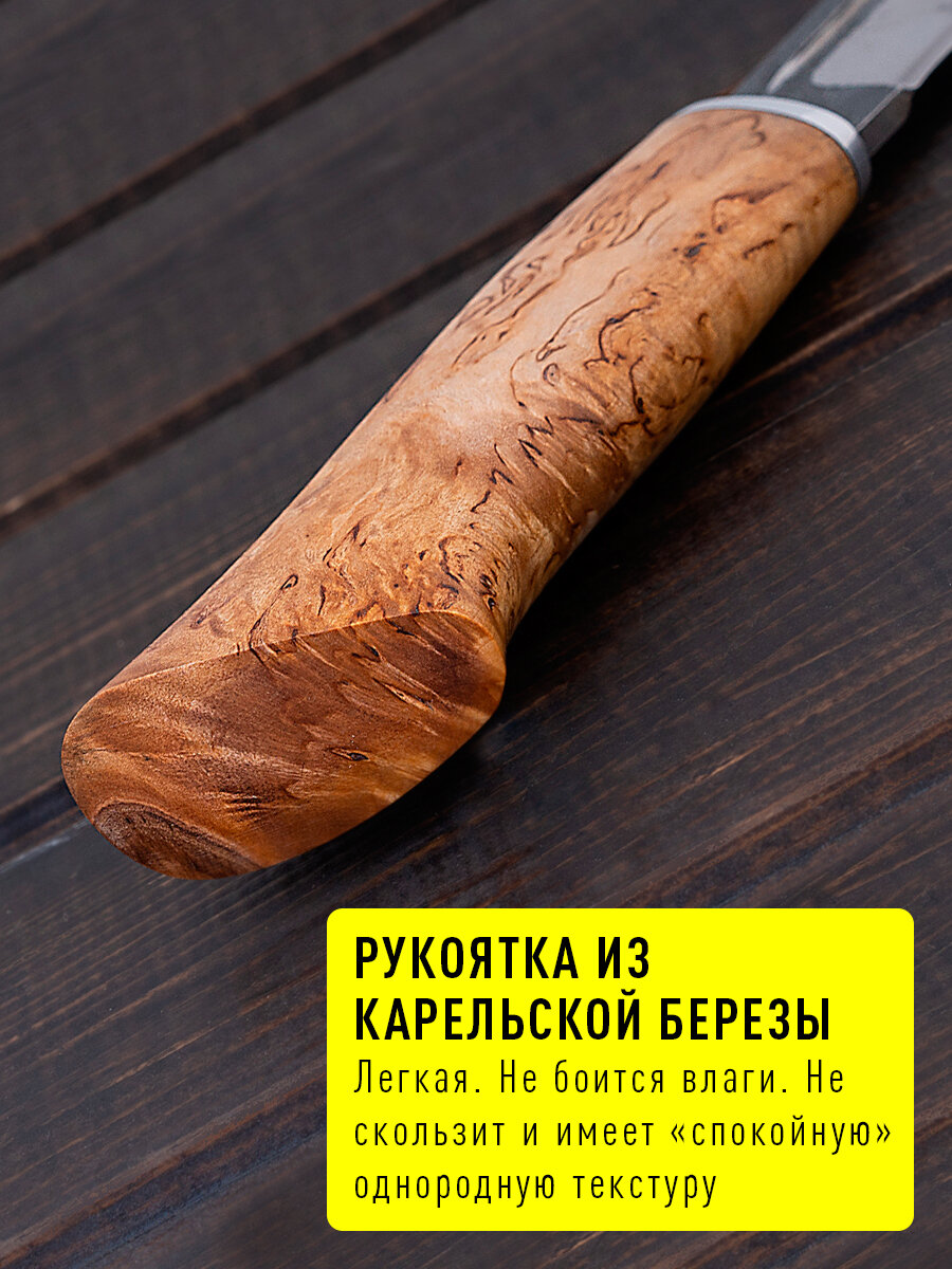 Купить Охотничий финский нож из кованой стали Х12МФ с рукояткой из Карельской березы с доставкой по всей России.