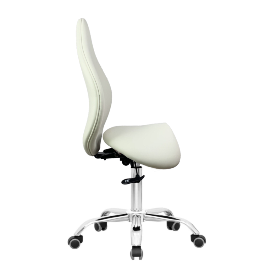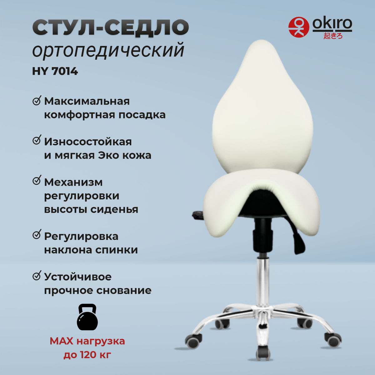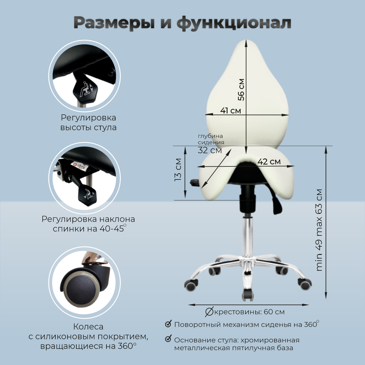 Стул седло ортопедический со широкой спинкой для офиса HY 7014 белый (молочный). У вас сидячая работа, и вы задумались, как избавиться от болей в мышцах спины и пояснице? У нас есть решение! Крутящийся стул на колесиках сочетает практичность и стиль. Яркий, современный дизайн гармонично вписывается в любой интерьер. Прекрасное решение для мастера маникюра, косметолга, стоматолога, бровиста, парикмахера, для швеи, для тату мастера, художника, 3D дизайнера, для школьника и инженера. А так же этот ортопедический стул можно использовать как стул офисный или компьютерное кресло. Это делает рабочий стул незаменимым элементом рабочего пространства для людей, которые проводят много времени в одной позе за работой или учебой. Смарт стул для переговорной оснащен удобным сидением и комфортной широкой спинкой имеющей анатомическую форму , пневматической регулировкой высоты сиденья-седла и регулировкой наклона спинки. Обивка выполнена из качественной эко-кожи, которая прослужит дольше обычной. Наполнитель из мебельного поролона средней жесткости. Установленные рычаги и пневматическая система позволяют регулировать высоту стула от 49 см до 63 см с учетом высоты сидения, угол наклона спинки на 40-45 градусов, Размеры сиденья: 42 х 32 х 13 см. Размер спинки: 56 х 41см. Диаметр крестовины:60 см. Колеса с силиконовым покрытием, вращающиеся на 360°. Колеса с силиконовым покрытием. Поставляется в разобранном виде.