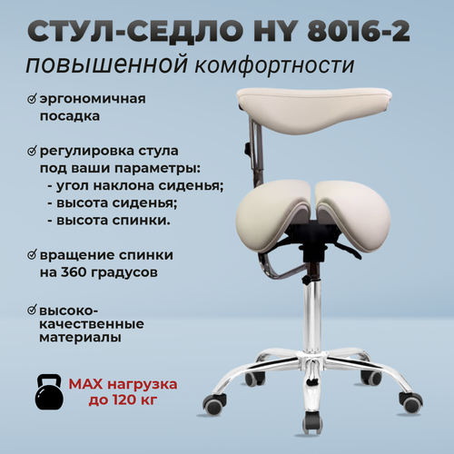 Стул для мастера модель HY 8016-2 (цвет молочный) — это отличный образец современного профессионального оборудования, характеризующийся высоким уровнем комфорта и практичности. Особая форма сиденья в виде двойного седла делает стул удобным для длительной работы. Специально разработанная форма стула заставит мастера выпрямить спину, что благотворно подействует на здоровье всего организма. Стул для оснащен удобным сидением и спинкой имеющей анатомическую форму , пневматической регулировкой высоты сиденья и наклона сиденья, а так же высоты поддерживающей спинки. Конструкция спинки имеет возможность вращения вокруг сиденья, а так же фиксируется в нужном положении с помощью винта. Обивка выполнена из качественной эко-кожи, которая прослужит дольше обычной. Наполнитель из мебельного поролона повышенной плотности. Нижняя поверхность седла , выполнена из белого глянцевого ABS пластика, что придает стулу особенный стиль. Установленные рычаги и пневматическая система позволяют регулировать высоту стула от 56 см до 63 см с учетом высоты сидения, угол наклона сидения регулируется на 15-18 градусов. Особая форма сиденья-седла делает стул удобным для длительной работы, таких мастеров как массажиста, косметолога, парикмахера, бровиста, художника и дизайнера. За счет наклона, спина не напряжена и находится в естественном положении, она устает гораздо меньше, а так же создает угол в коленных суставах в 135 градусов , что позволяет разгрузить колени и увеличить время работы мастера. Размеры сидения: глубина 36 х ширина 44 х толщина 3 см. Размер спинки: 13 х 48см. Основание спинки - черного цвета. Регулировка высоты спинки : от 21 до 29 см.(от седла). Диаметр крестовины: 60 см. материал: металл, хром. Колеса: прочный пластик . Поставляется в разобранном виде.