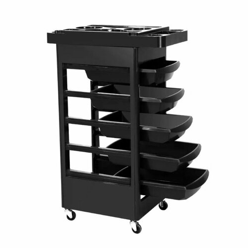 Профессиональная тележка для парикмахера OKIRO SL 01 цвет черный. Для каждого современного мастера салоны красоты важно удобство, мобильность и данный многофункциональный органайзер , чтобы иметь под рукой самые необходимые инструменты во время работы. Эта универсальная тумба подойдет для многих профессионалов: парикмахера - барбера, визажиста, бровиста, колориста, массажиста, тату мастера, косметолога. Лаконичный дизайн и функциональность стойки дополнит рабочее место бьюти мастера дома, подойдет так же для салона красоты, массажного кабинета, кабинета косметолога, парикмахерской и кабинета маникюра и педикюра. Подкатной столик с глубокими ящиками оснащен рабочей поверхностью оборудованной удобным держателем для фена, ножниц и большим количеством отверстий для расчесок, кистей для окрашивания, брашера, мисок для краски и других материалов и оборудования. Тележка для парикмахера выполнена из красивого черного пластика на прочном металлическом основании. В ней предусмотрены 5 выдвижных глубоких пластиковых ящика (размеры ящика 36 х 24 х 7 см) для хранения косметики, расходники, краски для волос и аксесуаров для наращивания, маникюрных пренадлежностей. Верхняя часть тележки - разделена на отсеки для парикмахерского оборудования, так же есть отделение для фольги с рельефным краем для резки - 12 х 8 см. В комплекте с тележкой идет дополнительно сама чаша из черного пластика объемом 300 мл. Этажерка на колесах имеет компактные размеры, поэтому может легко использоваться, как в большом, так и в малом помещении. А поворотные колеса на 360 градусов помогут без труда перемещать ее по любой поверхности будь то ламинат, плитка или линолеум. Размер тележки: высота 82 см, ширина 30 см, глубина 52 см. Расстояние между полками 11 см. Вес 5 кг. Поставляется в разобранном виде. Упаковка: картонная коробка.