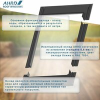 Изоляционные оклады AHRD изготовлены из алюминия (толщина 0,6 мм) с лакокрасочным покрытием, цвет оклада ближе к RAL 7024 • Оклад AHRD S для плоских кровельных материалов; • Оклад AHRD Z для профилированных кровельных материалов с высотой профиля до 10 см.