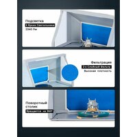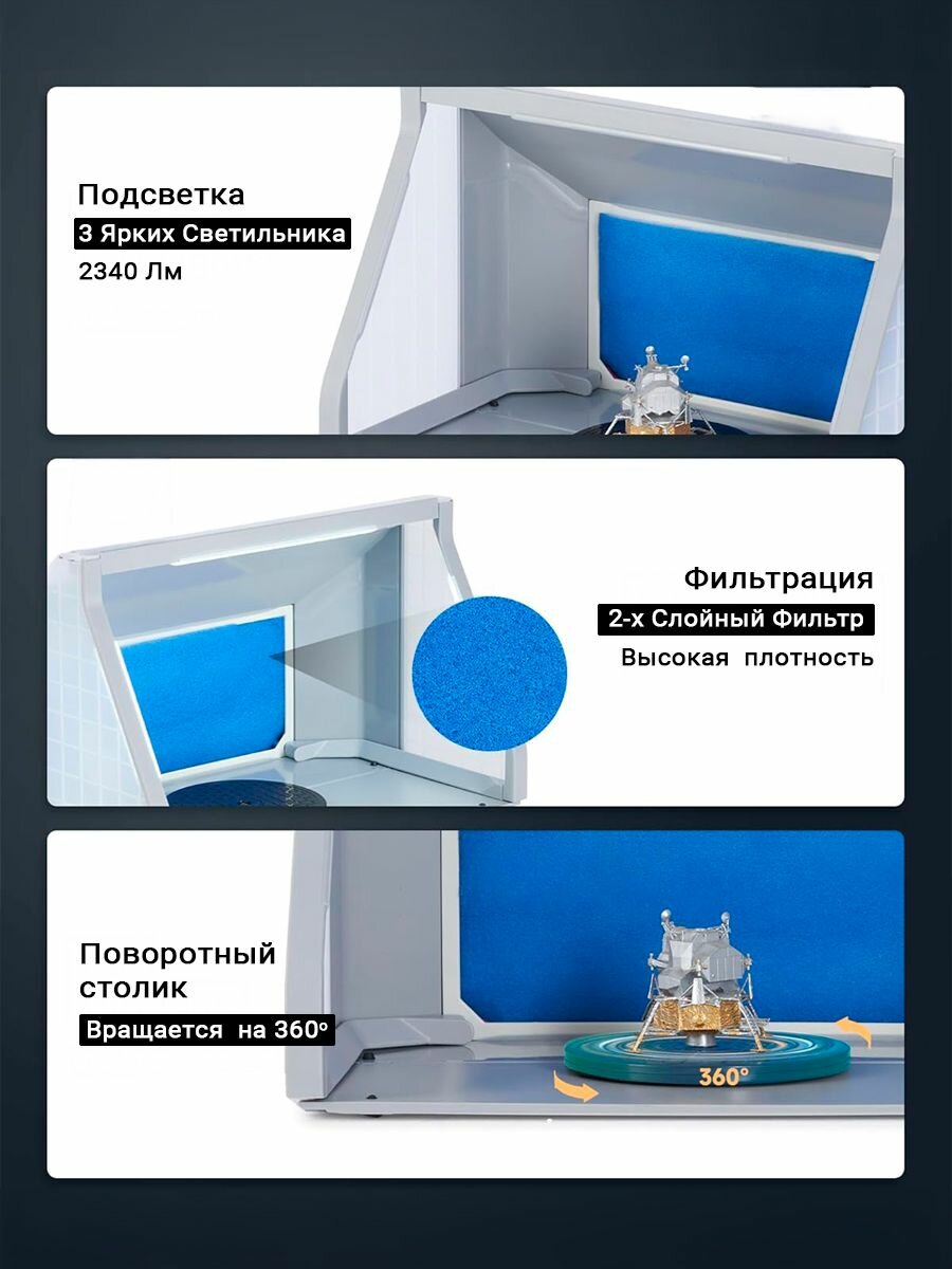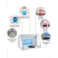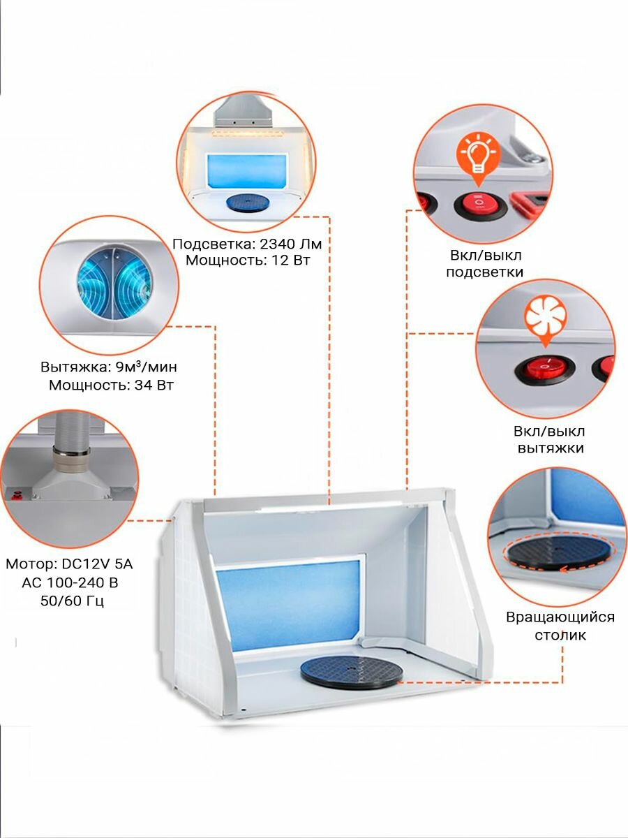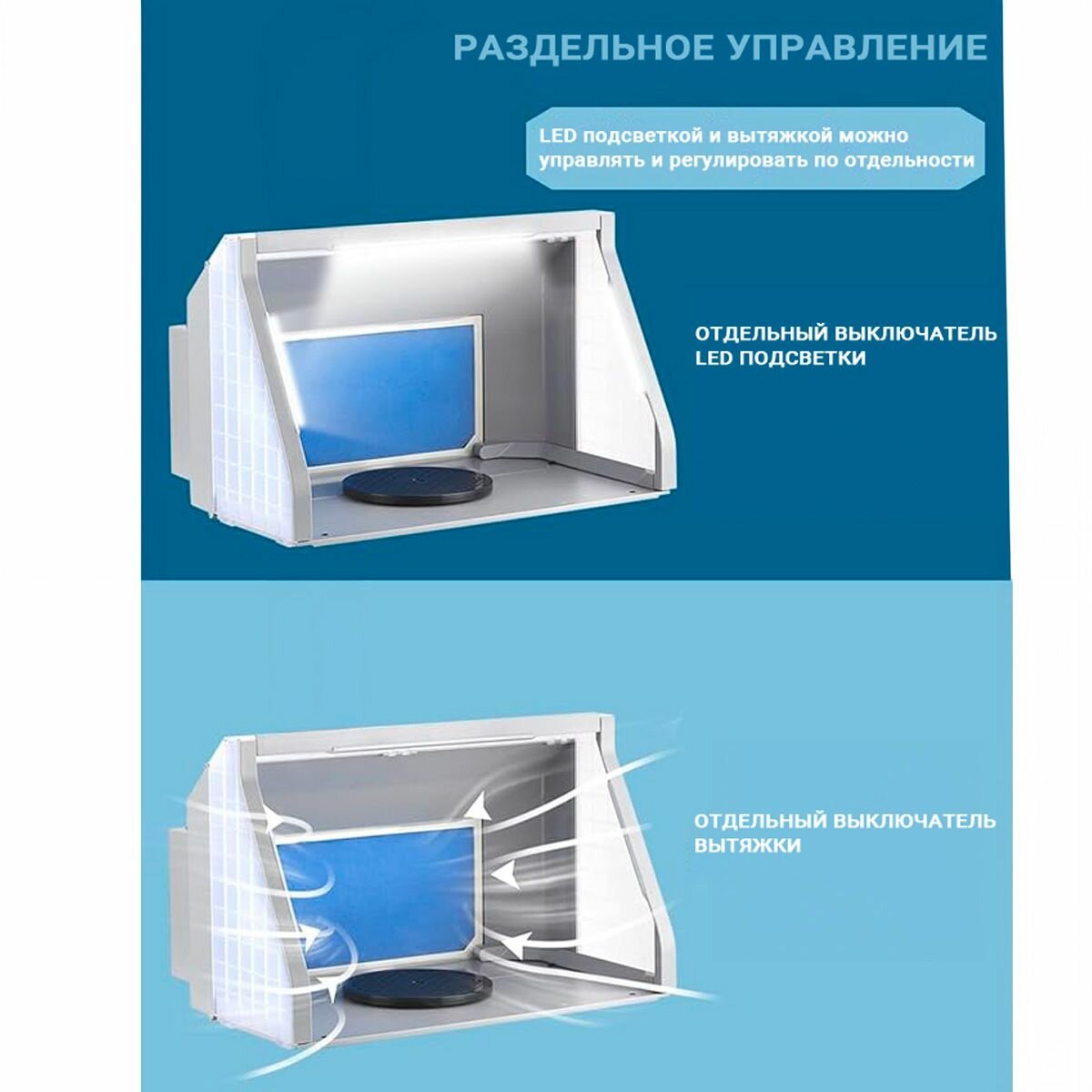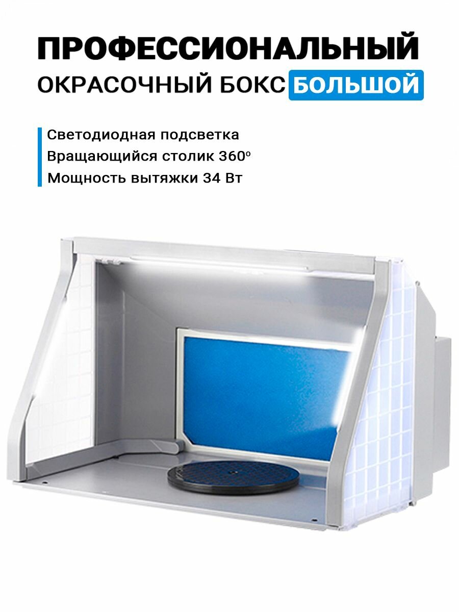 Решение проблемы окрасочного тумана при покраске аэрографом или баллонами. Бокс не только избавит вас от этой проблемы, но и удалит запах. Чтобы удалить запах надо отвести шланг вытяжки, например, в окно (шланг вытяжки в комплект не входит). Для окраски больших моделей можно поставить несколько боксов в ряд и получить одну большую, длинную камеру. Так же производитель позаботился об удобстве работы и добавил к боксу поворотный столик. Данная модель оснащается более производительным вентилятором и подсветкой.