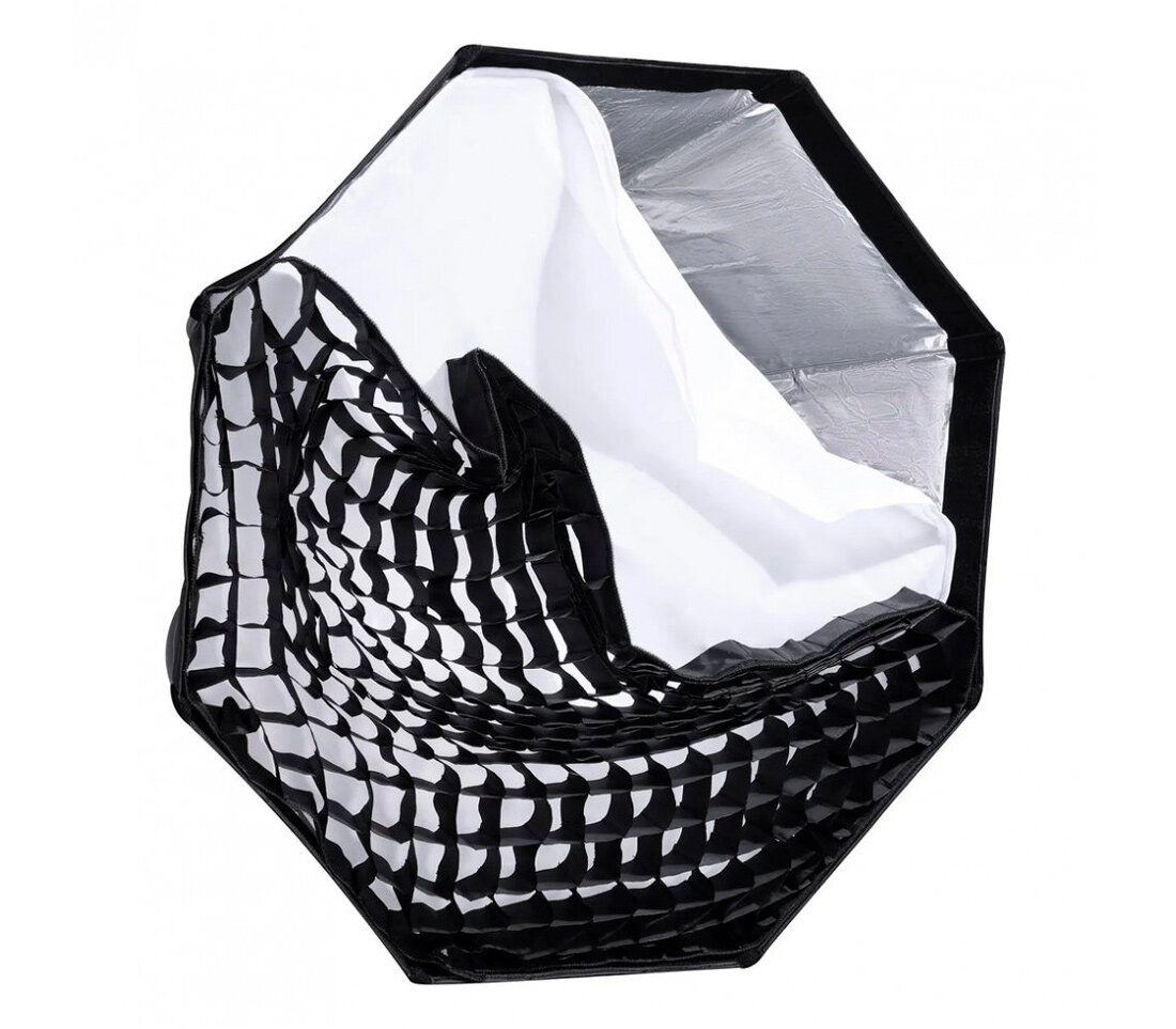 Компактный быстрораскладной октабокс для осветителей с широко распространенным байонетным креплением Bowens. В собранном виде помещается в небольшой чехол, разбирается за несколько секунд. Белый тканевый диффузор у этой модели один, он крепится внутри на липучках. Поверх диффузора можно установить тканевые соты, которые ограничивают угол рассеивания света, что позволяет точнее управлять освещением: освещать нужный объект, не засвечивая при этом области, которые должны оставаться в тени. Корпус софтбокса выполнен из плотной нейлоновой ткани, натянутой на 8 спиц, внутри – металлизированный серебристый слой.
