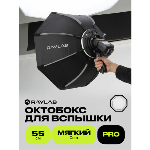 Октобокс для накамерной вспышки Raylab RL-SCG55G Этот софтбокс для вспышки идеально подходит для фото и для видео - для мобильных студий, блогеров, свадебных фотографов и любителей домашней съёмки. Быстроскладной и легкий, софтбокс для съемки позволяет удобно транспортировать и использовать его в любых условиях. Софтбокс для фотосъемки имеет защелки в пазах, которые надежно фиксируют спицы и отпускают их при повторном нажатии вниз, что обеспечивает быстрый и легкий монтаж. Рассеиватель для лампы имеет внутреннюю поверхность, которая выполнена из серебристого материала, обеспечивающего максимальное отражение и равномерное распределение света. Для получения более мягкого и направленного света в комплект входят 2 белых диффузора (рассеивателя). Это позволяет вам настроить освещение под свои нужды и получить идеальный результат. Софтбокс для предметной съемки станет отличным выбором, если вас интересуют предметная съемка, портретная съемка, фэшн съемка, студийная съемка или фуд съемка. Специальные отверстия в ручке позволяют установить адаптер на стойку или использовать как адаптер под вспышку или зонт, что делает быстроскладные октобоксы Raylab еще более универсальным инструментом для вашей работы.