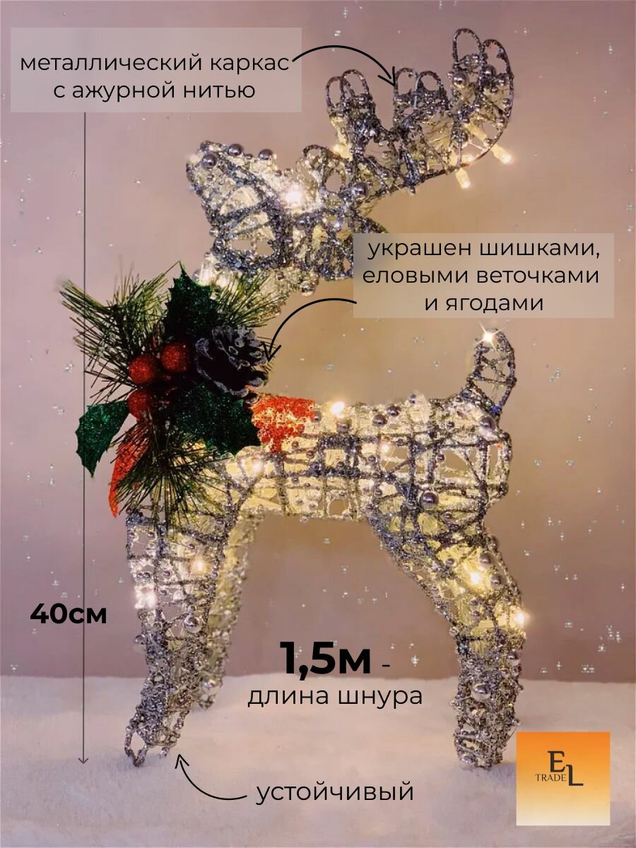 Олень светодиодный новогодняя декорация с подсветкой 40 см серебряный