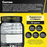 | Дополнительная информация | размер порции в г(мл): 10; назначение: стимулируют белковый синтез; повышают выносливость мышц; защищают мышцы от разрушения кортизолом; сжигают жир; повышают уровень глютамина в мышечной ткани; укрепляют иммунитет; рекомендации по применению: 1-2 порции в день - перед едой или перед и после тренировки или перед сном; состав: свободные аминокислоты (L-лейцин, L-валин, L-изолейцин), L-глутамин, ароматизатор, регуляторы кислотности - лимонная кислота, цитрат натрия, загуститель - камедь акации, подсластители - цикламат натрия, натрия сахарин, ацесульфам K, сукралоза, эмульгатор - лецитин, витамин B6 (пиридоксина гидрохлорид), краситель |