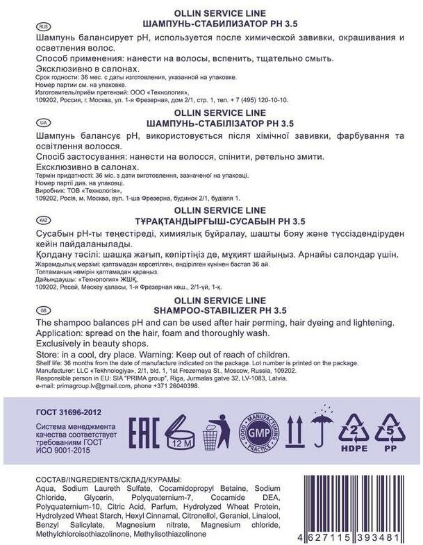 | Способ применения | нанести на волосы, вспенить, тщательно смыть. Используется после химической завивки, окрашивания и осветления волос |