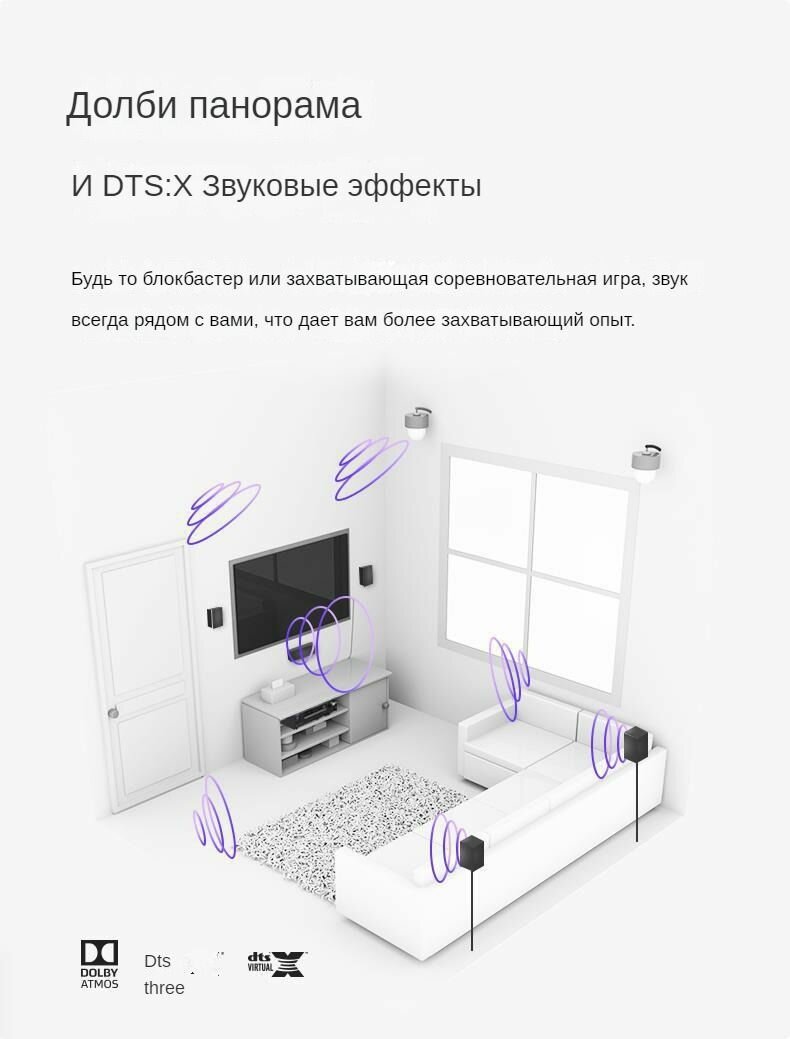 Эффект объемного звучания: Поддерживает Dolby Atmos и DTS: X, две основные технологии объемного звучания, а эффекты ATMOS могут быть достигнуты с помощью Dolby Atmos height virtualizer и DTS Virtual: X. В отремонтированных помещениях вы можете ощутить очарование трехмерной иммерсивной звуковой системы без установки динамиков на потолке.
