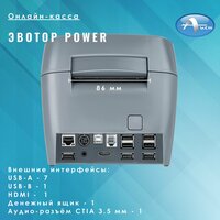 Эвотор Power: Ваш надежный помощник для эффективного бизнеса Добро пожаловать в мир инновационных технологий с Эвотор Power – смарт-терминалом и фискальным регистратором в одном устройстве. Эта умная онлайн-касса станет надежным помощником для вашего бизнеса благодаря мощному процессору NXP i.MX 8M Quad Plus и высокой скорости печати чека, благодаря термопечатающему механизму Seiko и металлическому автоотрезчику. Независимо от того, управляете ли вы магазином у дома, небольшим кафе или бизнесом с высокой нагрузкой в пиковые часы, Эвотор Power обеспечит вас надежным и быстрым обслуживанием клиентов. Это устройство сочетает в себе функциональность, стильный дизайн и простоту использования. Технические характеристики: Размеры, мм - 158×216×150 Вес без сетевого адаптера - 1750 г Процессор - NXP iMX 8M PLUS, Cortex-A53 4x1.8ГГц Операционная система - Evotor OS 5 Электропитание: Электропитание - Внешний сетевой адаптер с кабелем 24В, 6.67А, разъём KPPX-3P Параметры электросети - 220-240В, 50Гц Аккумулятор - нет Дисплей: Дисплей - 7", емкостный тип Разрешение экрана - 600×1024 Плотность экрана - 170 DPI Память: Объем оперативной памяти - 2 Гб Объем физической памяти - 16 Гб Дополнительная память - нет Интернет и беспроводные сети: Беспроводные сети - Wi-Fi 5 802.11a/b/g/n/ac, Bluetooth 5 Мобильный интернет - нет Ethernet - есть Печать чеков: Печатающее устройство - Термопечатающий механизм Seiko CAPM347G-E или PRT PT72A-35PMA (зависит от модификации) Скорость печати До 300 мм/сек Ширина чековой ленты - 80 мм (57 мм с переходником) Резак - Автоотрез, 2 металл. ножа, ресурс 2 млн. отрезов Внешние интерфейсы: USB-A - 7 USB-B - 1 HDMI - 1 Денежный ящик - 1 Аудио-разъём CTIA 3.5 мм - 1 Прочие: Камера - 1D 5 Мп, автоматический фокус Динамик - Есть Эксплуатационные характеристики: Срок службы - Не менее 3 лет Ресурс печатающего устройства - 200 км Климатические условия эксплуатации - Температура: от 0 до +45 °С, относительная влажность: не выше 85% при температуре +35 °С Климатические условия хранения и транспортировки (в заводской упаковке) - Температура: от −30 до +45 °С, относительная влажность: не выше 85% при температуре +35 °С Не упустите возможность повысить эффективность своего бизнеса с Эвотор Power – вашим надежным партнером для успеха. Закажите сейчас и ощутите разницу в вашем бизнесе!