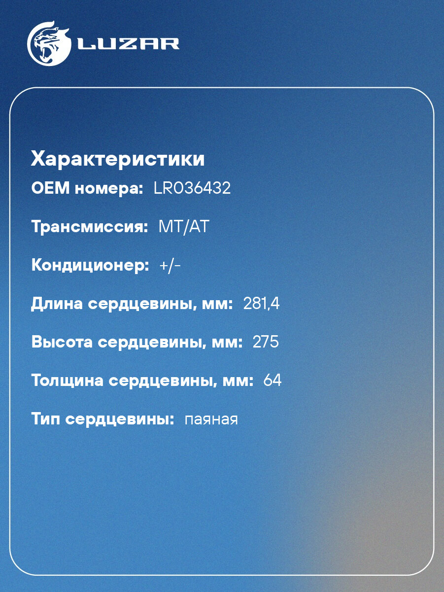 ОНВ (радиатор интеркулера) для а/м Land Rover Range Rover IV (12-)/Range Rover Sport II (13-) 3.0D/4.4D LRIC 1017 LUZAR: сравнение цен, характеристики, фото, актуальное наличие и цены.