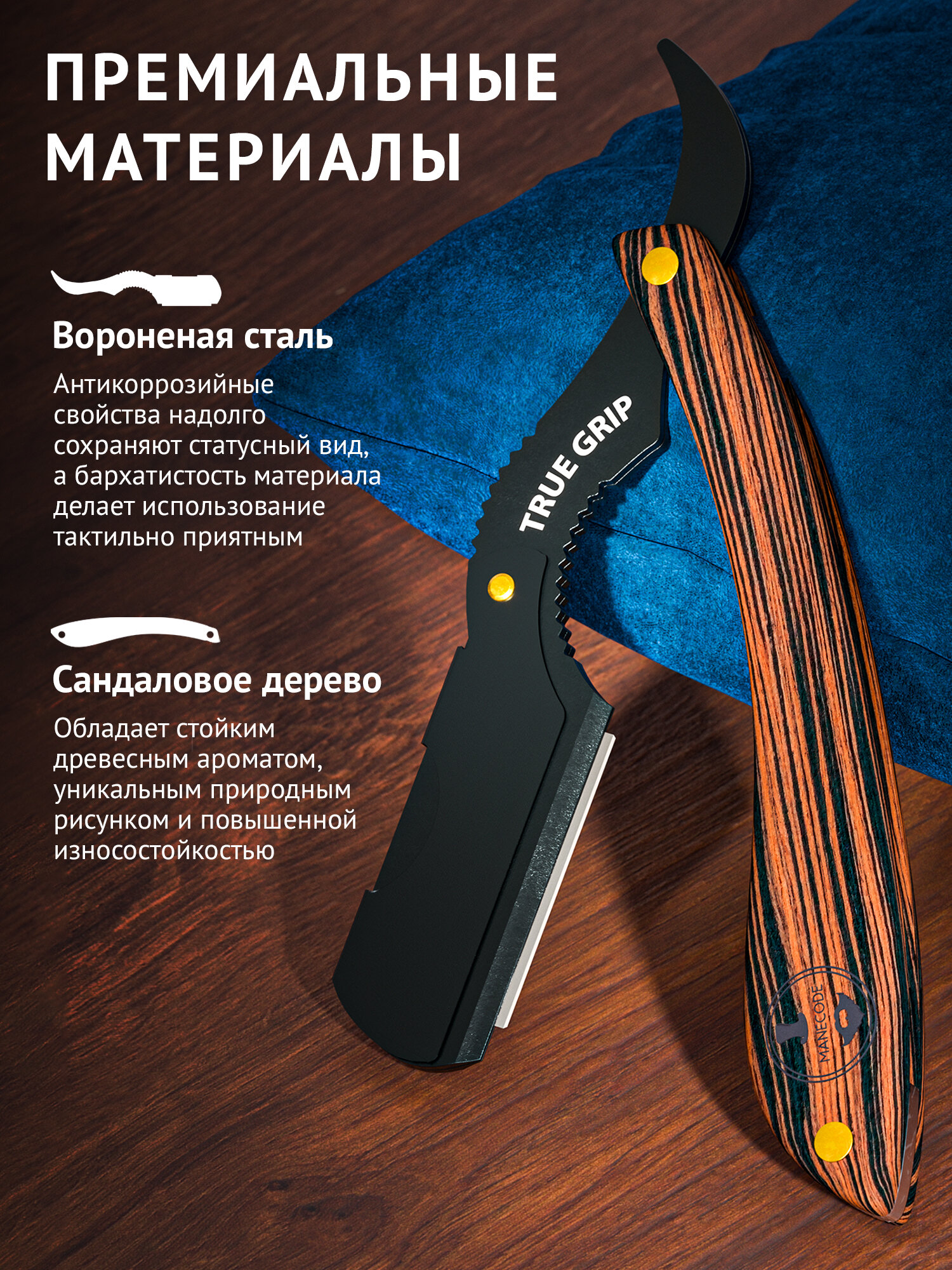 Опасная бритва Manecode DarkSword True Grip — идеальный выбор для настоящих ценителей качественного и комфортного бритья с претензией на индивидуальность. Это шаветт нового поколения из серии опасных бритв Manecode, созданный для тех, кто ценит точность, комфорт и эстетику в каждом движении. Бритва предназначена как для новичков, так и для опытных мастеров — признана профессионалами и идеально подходит в качестве подарка для мужчин. Благодаря уникальной конструкции и продуманному дизайну, шаветка обеспечивает максимальную остроту на протяжении всего срока службы. Лезвие надежно закреплено и располагается под углом 30–40 градусов, что способствует более гладкому и безопасному бритью. Это идеальный инструмент для бритья и моделирования бороды — позволяет добиться чётких линий и идеально выбритых участков без раздражений. Преимущества: • Совместима с двусторонними лезвиями — удобно и экономично. В комплекте уже есть 10 острых цельных лезвий. • Специальный True Grip-держатель с антискользящим протектором обеспечивает надёжный контроль под любым углом, обеспечивая аккуратное бритье без раздражения. • Идеальна как шаветка для бритья дома или в барбершопе. • Поставляется в премиальном футляре из экокожи на магнитной защелке и в красивой подарочной коробке, что делает её отличным вариантом для мужского подарка. • Компактная, безопасная и стильная — её удобно брать в поездки. Manecode DarkSword True Grip — не просто аксессуар, а настоящее оружие в арсенале современного мужчины. Она станет отличным выбором для тех, кто следит за стилем и ухоженностью своей бороды. Превратите каждое бритьё в ритуал с бритвой Manecode.