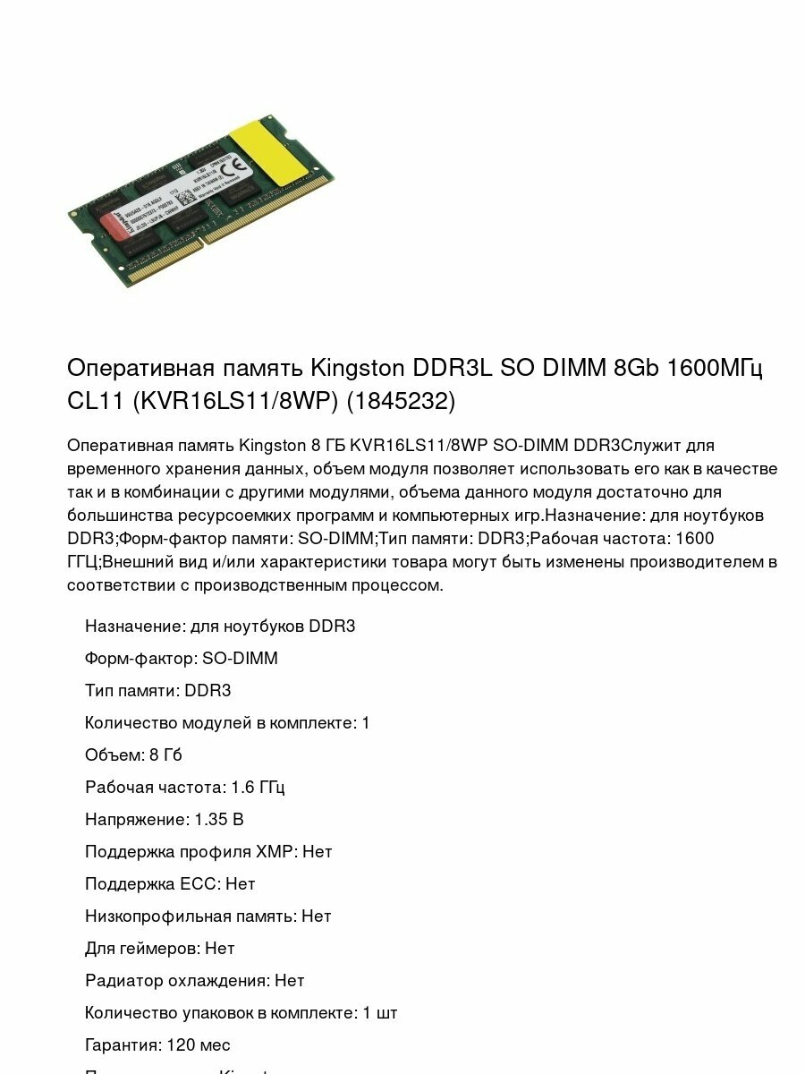 Купить Оперативная память Kingston DDR3L SO DIMM 8Gb 1600МГц CL11 (KVR16LS11/8WP) (1845232) с доставкой по всей России. Оперативная память Kingston DDR3L SO DIMM 8Gb 1600МГц CL11 (KVR16LS11/8WP) (1845232): сравнение цен, характеристики, фото, актуальное наличие и цены.
