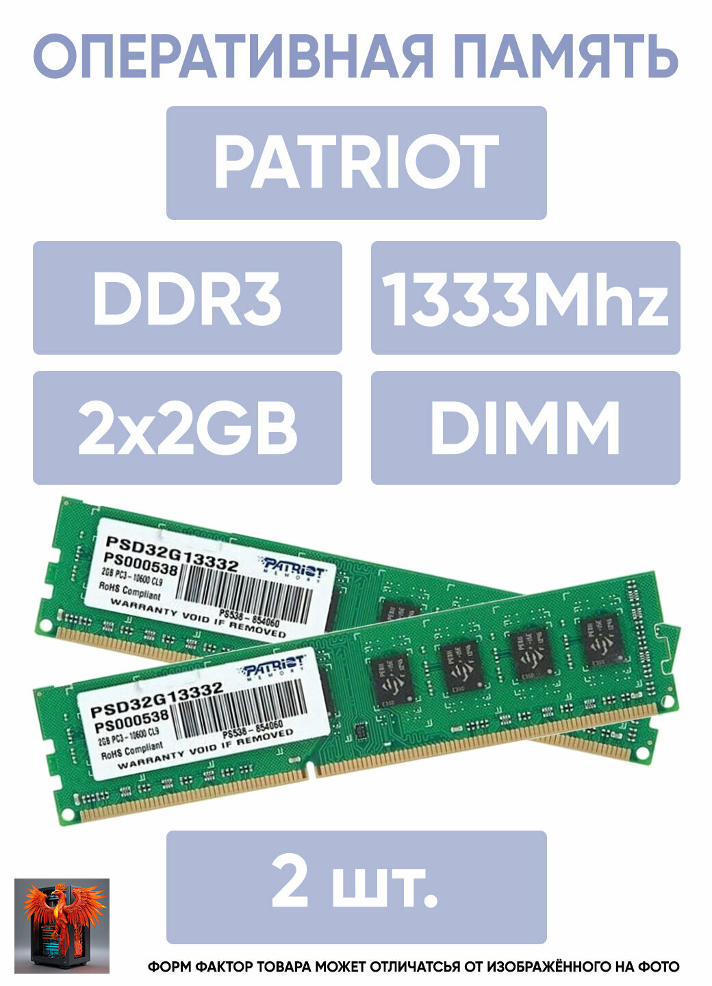 Оперативная память Patriot 4Гб (2×2 Гб) DDR3 1333 (PC 10600) DIMM 240 pin, 1.5 В, CL 9 RTL PSD32G13332: сравнение цен, характеристики, фото, актуальное наличие и цены.