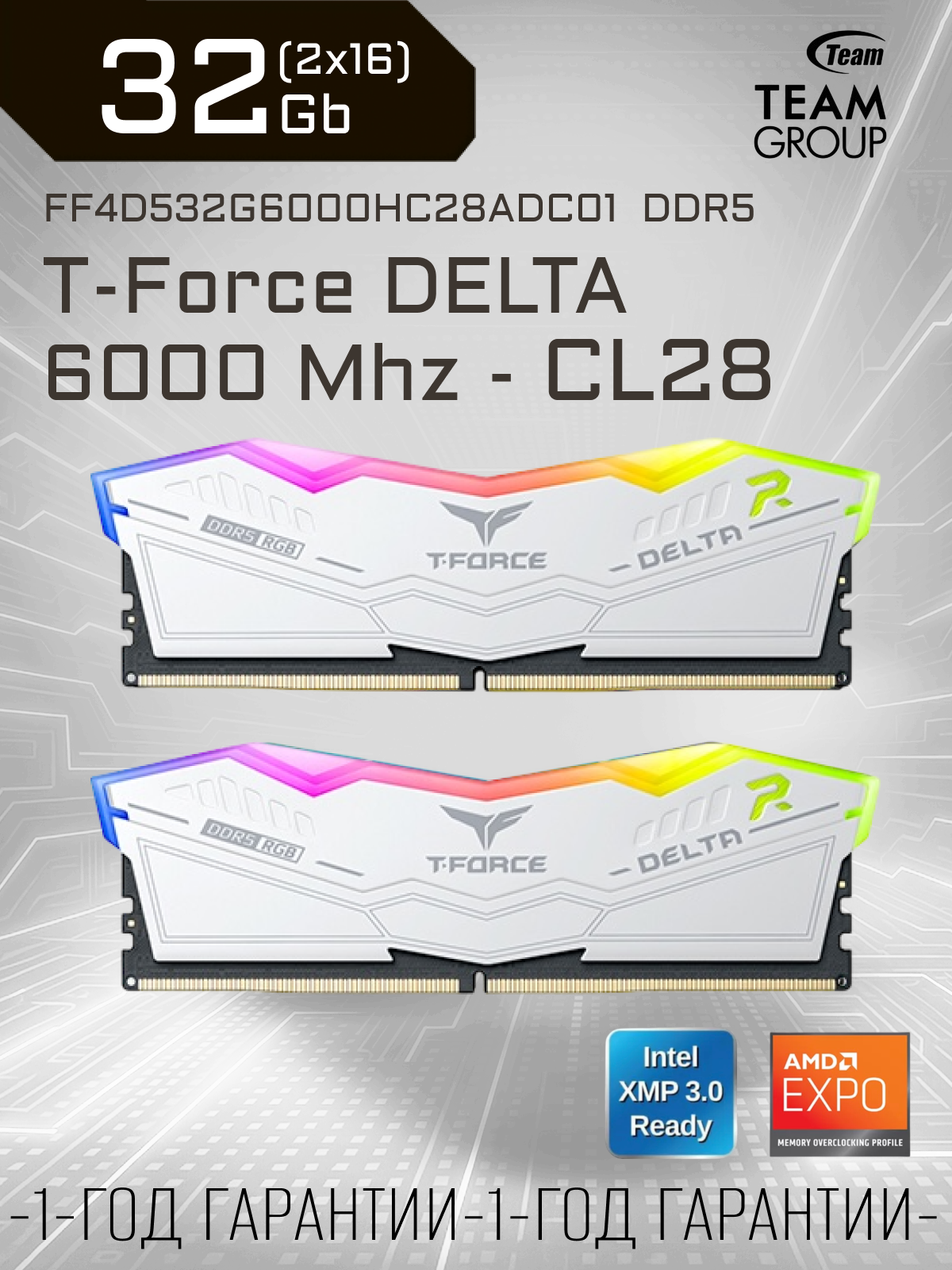 Оперативная память TeamGroup T-Force Delta, 32GB, 6000MHz, CL28, RGB, белая: сравнение цен, характеристики, фото, актуальное наличие и цены.