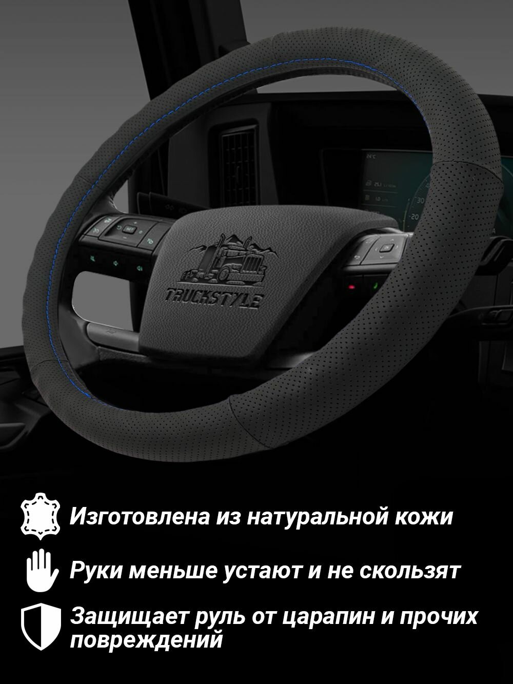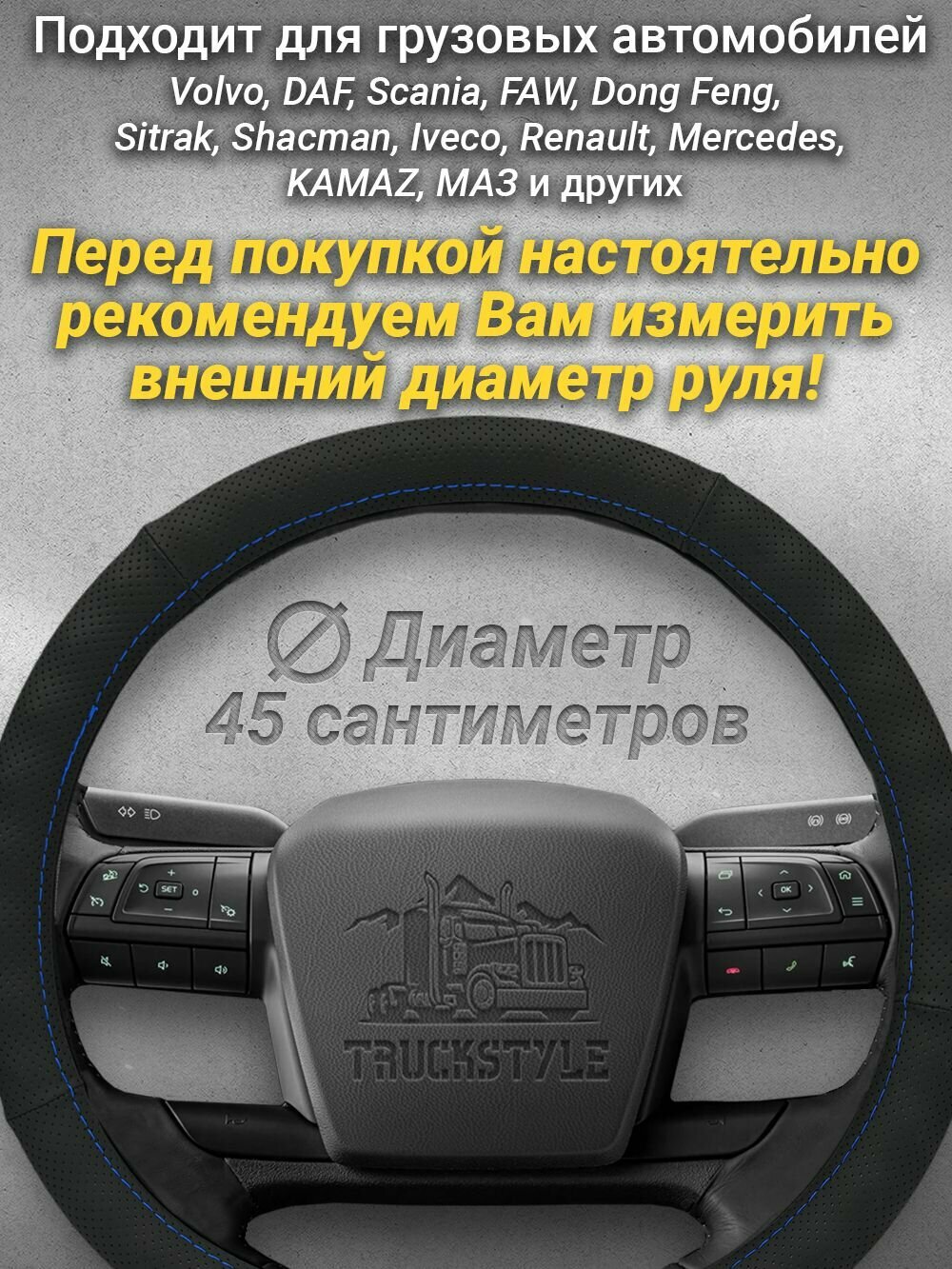 Оплетка на руль грузового автомобиля 45 см. Черный цвет, синяя строчка, натуральная кожа с перфорацией. Подходит на SITRAK, SHACMAN, VOLVO и пр. Аксессуар для грузовика: сравнение цен, характеристики, фото, актуальное наличие и цены.