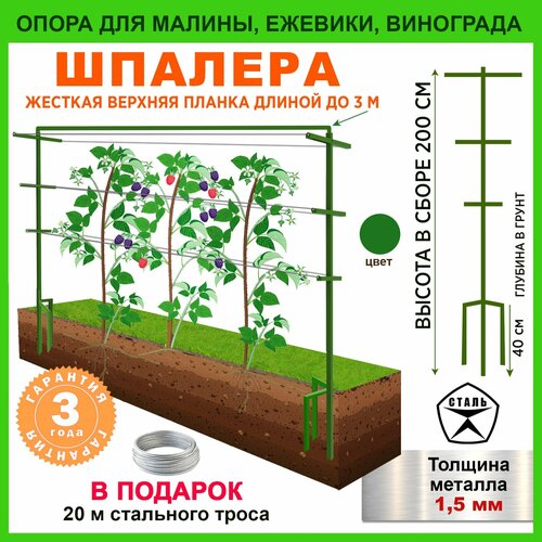 Шпалера металлическая (комп. 2шт. + верхняя жесткая планка) садовая для растений и кустарников. Верхняя планка обеспечивает дополнительную фиксацию между стойками. Данная шпалера с верхней жесткой планкой хорошо подходит для применения в мягких, сыпучих грунтах. Опора для кустов малины, ежевики, винограда, также подойдет для кустовых роз, декоративных и плодово-ягодных растений. Конструкция поддерживает ветви растений и предотвращает их провисание и перелом. При использовании данной конструкции (шпалеры) растение получает равномерно свет и тепло, тем самым значительно снижается вероятность заболевания растения и появления вредителей. Высота шпалеры регулируется от 50 до 160 см. Прикладывается комплект крепежа и 20 метров стального троса в ПВХ оболочке.