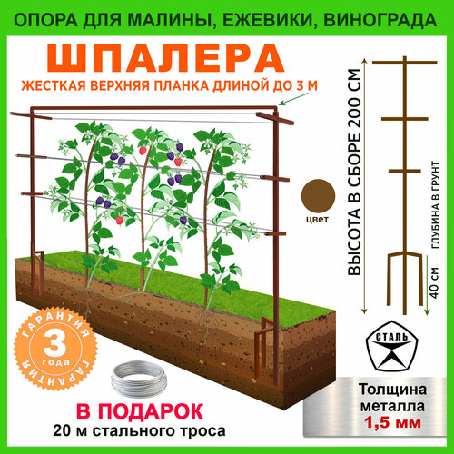 Шпалера металлическая (комп. 2шт. + верхняя жесткая планка) садовая для растений и кустарников. Верхняя планка обеспечивает дополнительную фиксацию между стойками. Данная шпалера с верхней жесткой планкой хорошо подходит для применения в мягких, сыпучих грунтах. Опора для кустов малины, ежевики, винограда, также подойдет для кустовых роз, декоративных и плодово-ягодных растений. Конструкция поддерживает ветви растений и предотвращает их провисание и перелом. При использовании данной конструкции (шпалеры) растение получает равномерно свет и тепло, тем самым значительно снижается вероятность заболевания растения и появления вредителей. Высота шпалеры регулируется от 50 до 160 см. Прикладывается комплект крепежа и 20 метров стального троса в ПВХ оболочке.