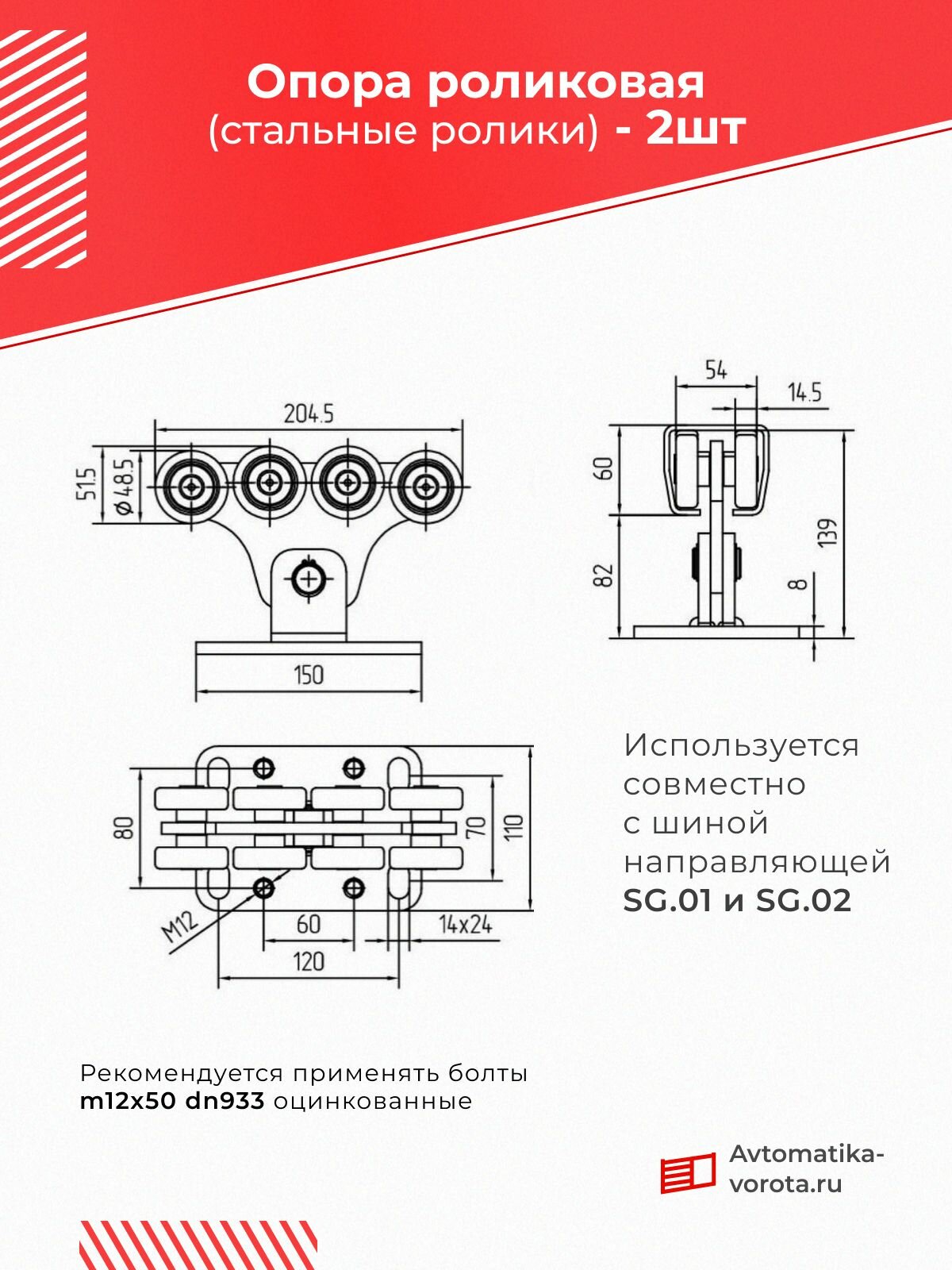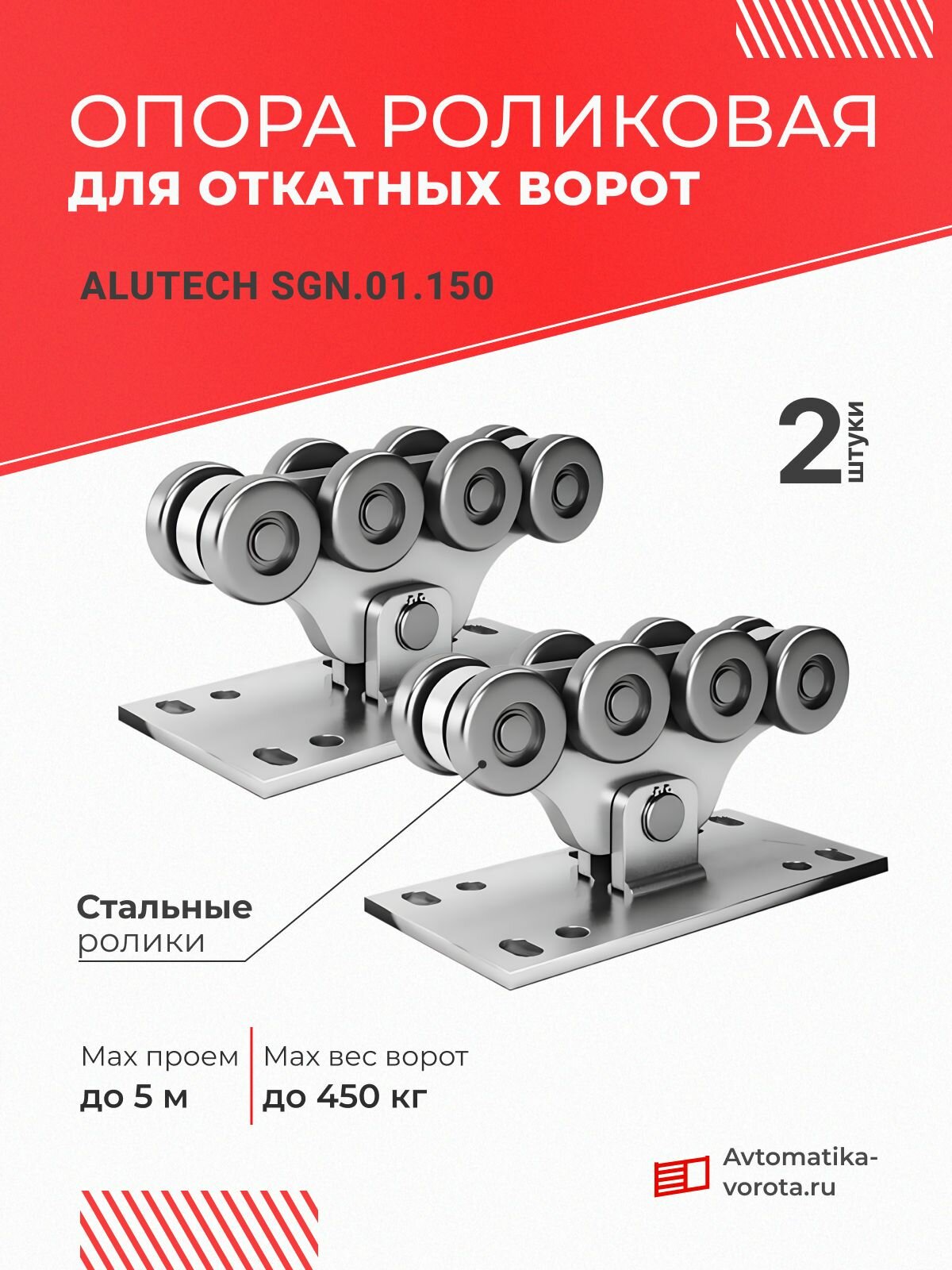 Опора роликовая со стальными роликами предназначена для перемещения створки самонесущих откатных ворот. Используется для изготовления ворот на шине SG.01x. Для регулировки опоры по высоте рекомендуется применять болты M12x50 DN933 оцинкованные. Надежность и долговечность комплектующих серии SGN обеспечивается за счет высоких прочностных характеристик используемых материалов, усовершенствованных конструкторских разработок, а также защитного оцинкованного покрытия, которое предотвратит коррозию в процессе эксплуатации. Роликовые опоры в конструкции откатных самонесущих ворот воспринимают нагрузки от створки ворот и передают их на фундамент, обеспечивают перемещение створки в направлениях, предусмотренных конструкцией ворот. Опоры подбираются исходя из массы полотна ворот. Предназначены для перемещения в заданном направлении створки откатных ворот весом до Предназначены для перемещения в заданном направлении створки откатных ворот весом до 450 кг и максимальная ширина проезда 5 (м). Для обеспечения работоспособности ворот в зимний период в подшипниках применяется консистентная смазка до -40.