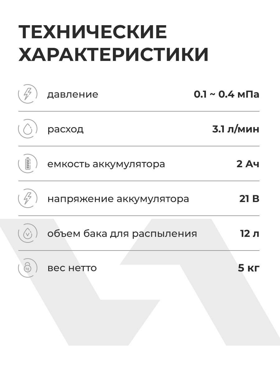 | Дополнительная информация | Комплектация: Опрыскиватель; Аккумулятор; ЗУ; Сменная насадка - 2 шт; Инструкция |