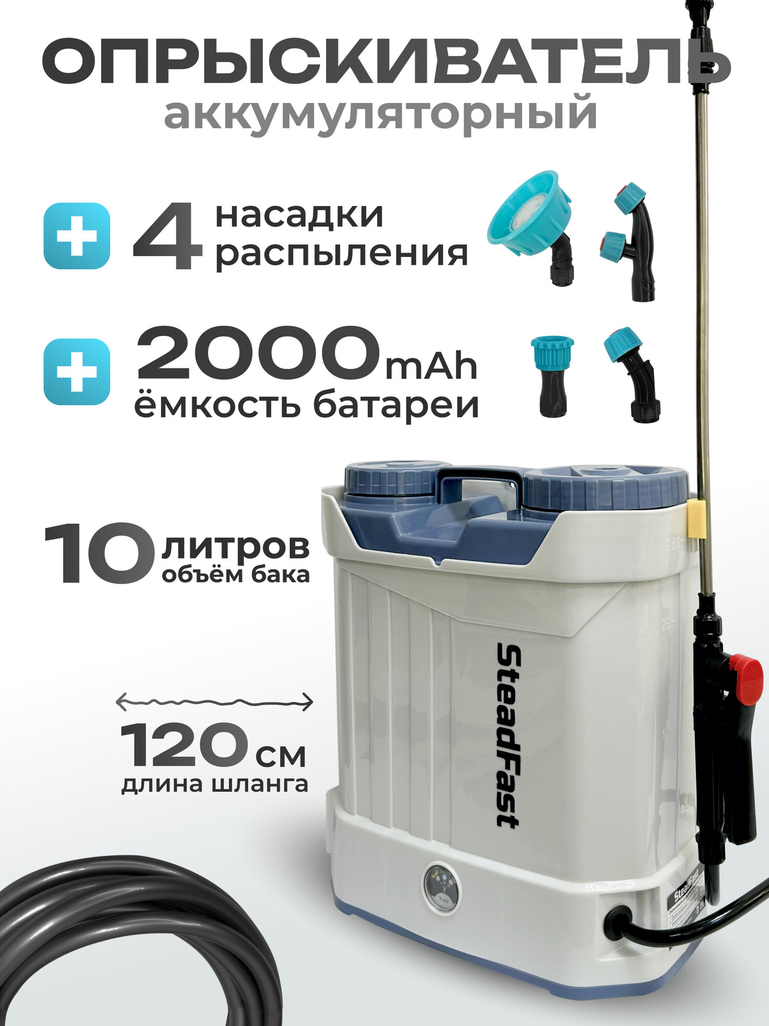 Купить Опрыскиватель аккумуляторный садовый ранцевый SteadFast SF 10, 10 литров, телескопическая трубка, 4 насадки, для сада, для огорода, для автомобиля с доставкой по всей России.