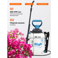 Опрыскиватель садовый с брандспойтом 650-970 мм Жук Эксперт- необходимый инструмент для любого владельца земельного участка, на котором выращиваются растения. Помпа опрыскивателя работает по принципу ручного насоса. Сначала прокачивается стержень для создания избыточного давления воздуха в баке. После этого нажимают на рычаг, и воздух начинает выталкивать жидкость и происходит процесс опрыскивания. С помощью мелкодисперсного пульверизатора брызгалки можно не только поливать цветы, рассаду на грядках или другие нежные растения, но и распылять удобрения или различные химикаты, дезинфицировать и применять пшикалку в других целях. Распылитель для воды имеет штуцер регулировки струи: широкий туман для орошения или узкая струя для глубокого проникновения.