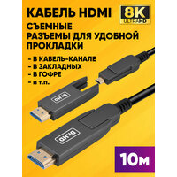 Это специализированный оптический HDMI-кабель, который, помимо преимуществ поддержки HDMI 2.1, имеет очень важную особенность – съемные коннекторы (разъемы) с обеих сторон. Благодаря этому, такой кабель очень удобно прокладывать в гофру, кабель каналы и прочие узкие места. Такая конструкция делает его самым удобным HDMI кабелем для прокладки. Длина кабеля 10 метров.