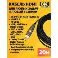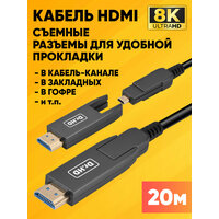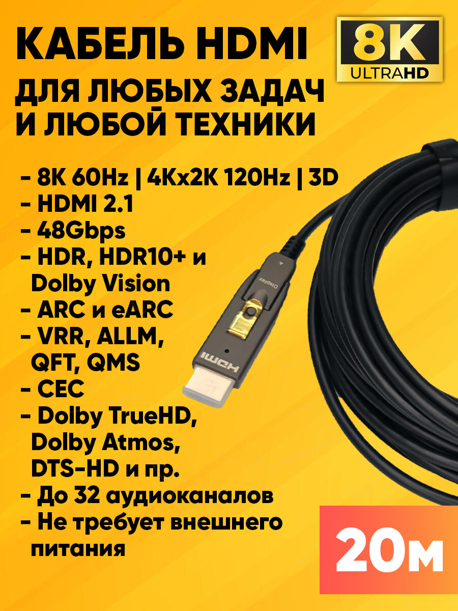 Оптический HDMI кабель со съемными коннекторами (разъемами) – это высококачественный специализированный кабель, разработанный специально для удобной прокладки в гофре, кабель канале и всевозможных узких закладных, куда невозможно уложить обычный HDMI кабель с его громоздкими разъемами. Модель имеет поддержку всех спецификаций стандарта HDMI 2.1: 8K 60Hz, 4K 120Hz, 3D, скорость передачи 48Gbps, HDR10+, Dolby Vision CEC, eARC, VRR, ALLM и прочее. Длина кабеля 20 метров.