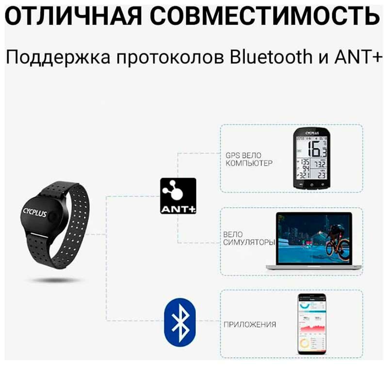 Наручный пульсометр CYCPLUS поддерживает все устройства с Bluetooth Smart и ANT+. Легко подключается к смартфонам, планшетам, GPS-часам и велокомпьютерам. Вы можете синхронизировать данные с вашей любимым приложением для тренировок, например Strava. Монитор сердечного ритма H1 использует фотоэлектрическую технологию мониторинга сердечного ритма, которая получает данные о частоте сердечных сокращений по отражающимся в инфракрасном спектре волн от теле человека, обеспечивая доступ к более точным данным о частоте сердечных сокращений. Данный пульсометр имеет длительный срок службы батареи более 20 часов. Нет опасности внезапного отключения питания, поэтому вы можете носить его и заниматься всеми видами фитнеса. Монитор сердечного ритма CYCPLUS имеет водонепроницаемый корпус с защитой IP67, который подходит для ежедневных тренировок в помещении или на открытом воздухе. Вес пульсмотреа в 19 граммов - больше нет необходимости в громоздком нагрудном ремне.