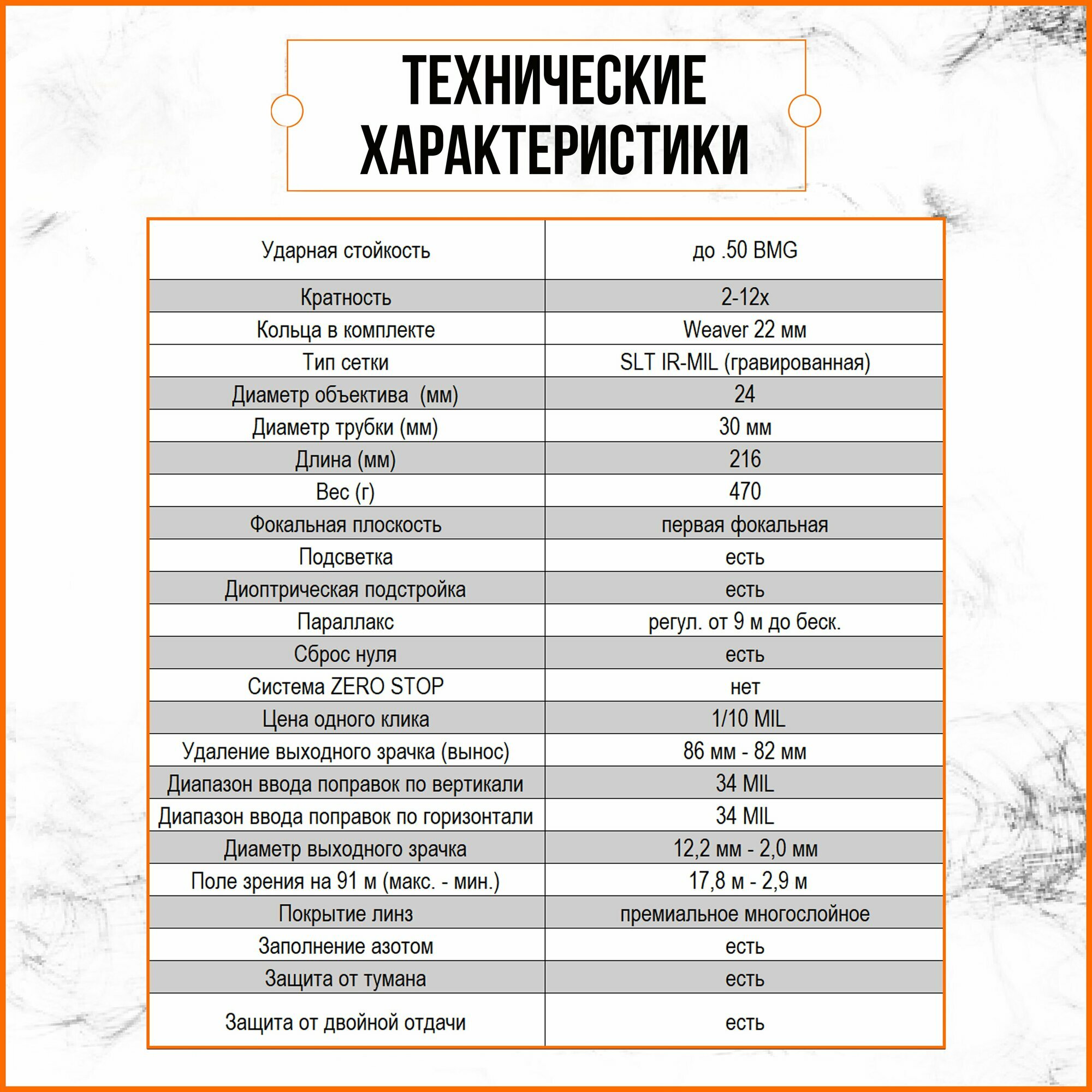Оптический прицел оснащен линзами с премиальным многослойным покрытием, что обеспечивает четкое и яркое изображение с высоким разрешением, позволяя различать мельчайшие детали объекта даже на больших расстояниях. Кратность 2-12x: позволяет быстро адаптироваться к различным условиям охоты и стрельбы, обеспечивая как широкий обзор, так и детализированное прицеливание. Объектив 24 мм: гарантирует отличную светопропускную способность при компактных размерах, что делает прицел легким и удобным для длительного использования. Первая фокальная плоскость обеспечивает точное масштабирование и сохранение пропорций прицеливания при изменении увеличения. Важной особенностью оптического прицела Discovery является наличие технологии SFIR. SFIR представляет собой специализированную систему инфракрасного видения. Эта технология позволяет прицелу эффективно использовать инфракрасное освещение для создания четкого и детализированного изображения цели даже в условиях недостаточной видимости. SFIR снижает влияние внешних источников света и минимизирует помехи, обеспечивая высокую контрастность и ясность изображения. Корпус прицела изготовлен из прочного высококачественного материала. Ударная стойкость прицела составляет до .50 BMG. Малый вес (470 г.) и компактные размеры делают прицел удобным для длительного использования и легкой транспортировки. Прицел оптический Discovery HD 2 12x24 SFIR оснащен интуитивно понятными элементами управления, которые позволяют быстро и легко настраивать прицел под индивидуальные потребности пользователя. Оптический прицел Discovery HD 2 12x24 SFIR сочетает в себе передовые технологии, надежную конструкцию и удобство использования. Этот прицел станет незаменимым помощником как для профессиональных охотников, так и для любителей точной стрельбы, обеспечивая высокую точность и превосходное качество изображения в любых условиях. Комплектация:
