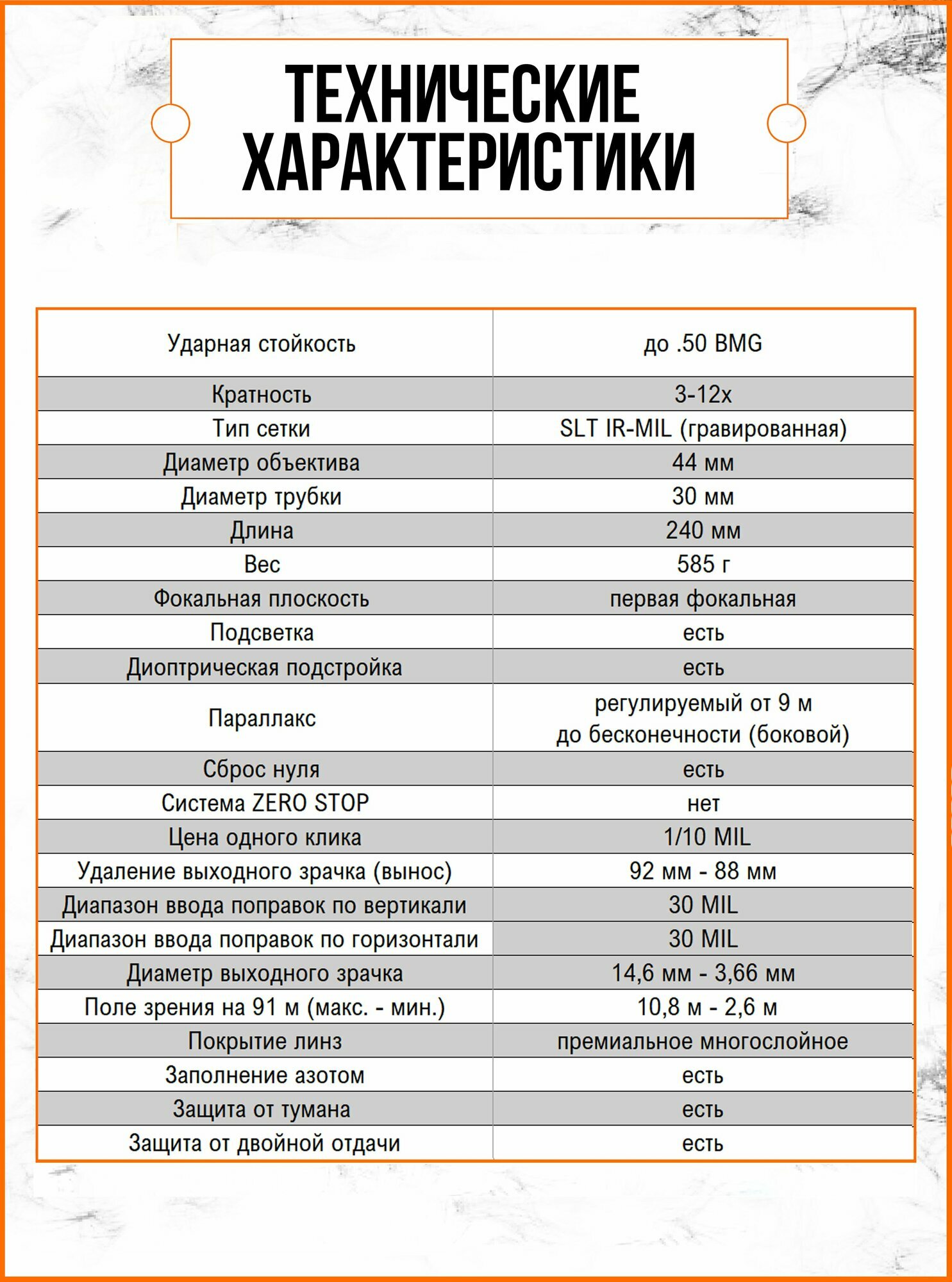 Прицел выдерживает двойную отдачу пружинно-поршневых винтовок. Ударостойкость прицела позволяет устанавливать его на огнестрельное оружие до 308 калибра включительно, а так же на PCP и пружинно-поршневую пневматику. Гарантия 12 месяцев. Оптический прицел DISCOVERY HD 3-12X44 SFIR FFP произведен на заводе Discovery Optical Instrument, очень компактный и имеет увеличением от 3 до 12 крат. Предназначен для ведения прицельной стрельбы на коротких и средних дистанциях во время охоты, а также соревнований. Прицельная сетка IR MIL - это баллистическая сетка на основе Mildot, гравированная на стекле, градуирована в угловых минутах (МОА), в первой фокальной плоскости (FFP - first focal plane). Такая сетка позволяет держать цену деления разметки постоянной независимо от выставленной кратности прицела, облегчая расчет дистанции и ввод поправок выносом. Сетка тонкая и удобна для введения поправок по делениям как по вертикали, так и по горизонтали, с учетом силы ветра. При этом прицельная сетка имеет многоступенчатую подсветку, что добавляет удобства при стрельбе в сумерках. Прицел обладает картинкой с повышенной четкостью и расширенным полем зрения. Отстройка от параллакса расположена сбоку на узле ввода поправок (SF - side focusing). Прицел имеет полное многослойное просветление линз. Барабаны внешние с фиксацией и функцией обнуления. Диаметр трубки прицела - 30 мм. В комплекте с прицелом идут кольца под планку Weaver/Picatinny.