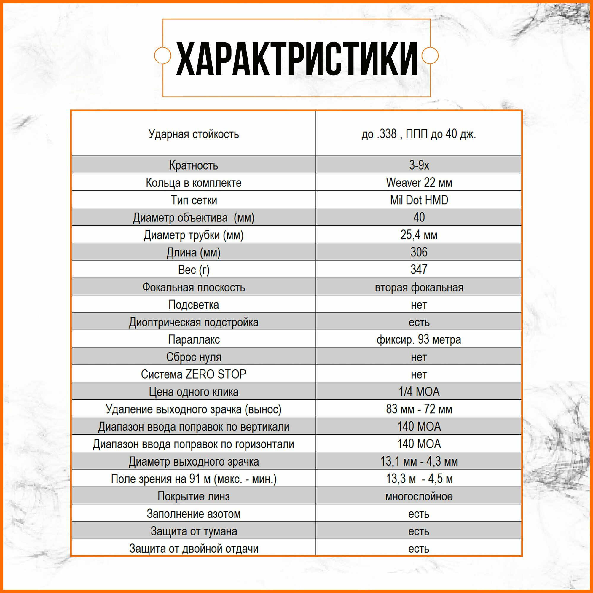 - Сетка Mil Dot HMD: Универсальная прицельная марка, позволяющая точно корректировать выстрелы и учитывать боковой ветер или расстояние до цели.