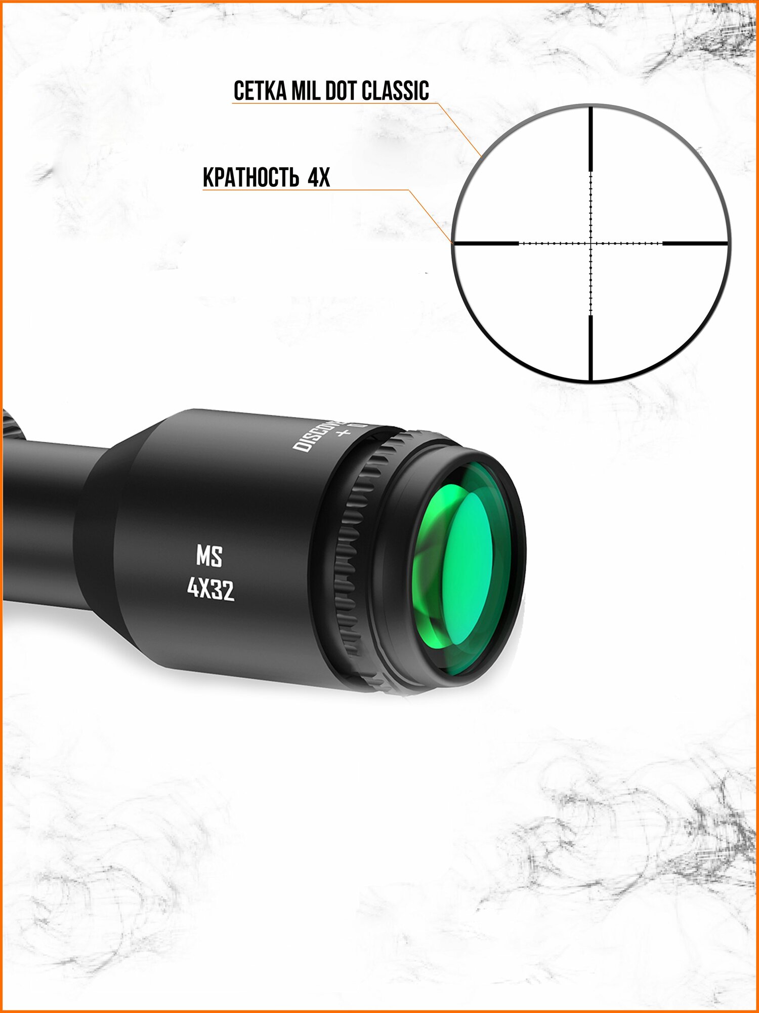 С технической точки зрения модель Discovery проста - база основана на фиксированном 4х увеличении - такая кратность считается универсальной. 32 миллиметровая линза отличается наличием FMC покрытия, нанесенного в несколько слоев - его присутствие увеличивает степень пропускаемости света, что делает возможной работу с прицелом при малой освещенности. Также оно помогает бороться с бликами.