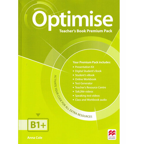 Optimise B1+. Teacher's Book Premium Pack. Teacher's Book Premium Pack – книга для учителя в печатном формате с кодом доступа к Teacher’s Resource Centre, Presentation Kit: Student's Book и Workbook, Digital Student's Book, Online Workbook, Test Generator и Student's Book eBook. Код действителен в течение 48 месяцев с момента активации.