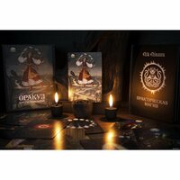 «Этот набор результат моей многолетней исследовательской работы и практики в сфере колдовства. Он состоит из книги по практической магии и авторского Оракула «Карты Гадальные». Колода изначально рисовалась вручную, напечатана с черным матовым срезом.