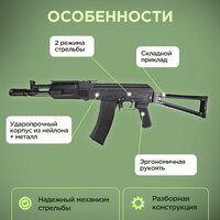 Автомат на орбизах RX AK102 с металлом черного цвета для игры в гидробол (орбибол) является копией знаменитого автомата серии АК-102. Копийный автомат для орбибола (гидробола) выполнен в масшиабе 1:1. Оружие сделано с использованием металла и высококачественного полимера (нейлона). Благодаря этому оно приятно "лежит" в руках и ощущается "как настоящее". Переводчик режима огня имеет три положения: предохранитель, автоматический огонь и одиночный выстрел. В автомате реализована система имитации отдачи и подвижный затвор при выстрелах, потому оружие выглядит антуражно и эффектно стреляет. На цевье есть 4 планки Пикатинни. стандартная резьба -14 позволяет установить трассерную насадку. Приклад складывается и надежно фиксируется слева. Имеет антабку на прикладе. Сбоку есть стандартная планка крепления "ласточкин хвост" для кронштейна.