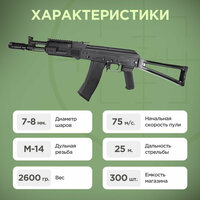 Возрастная категория, лет 10+ Калибр шаров, мм. 7-8 Скорострельность, выстр./мин. 500 Скорость гидрошара, м/сек 60 Аккумулятор, V 11,1V Вес коробки, гр. 4000 Вес модели, гр. 2600 Емкость магазина, шт. 300 Максимальная дальность, м. 30 Материал изготовления нейлон(полимер)металл Параметры резьбы (для дульной насадки) М -14 Подача шаров снизу Прицельная дальность, м. 25 Размер коробки, см. 75*35*8 Размер модели, см. 85*26*8 Режимы огня одиночный, автоматический Стволик гирбокса Металл Тип магазина электрический Цвет черный Шестеренки Нейлон(полимер)
