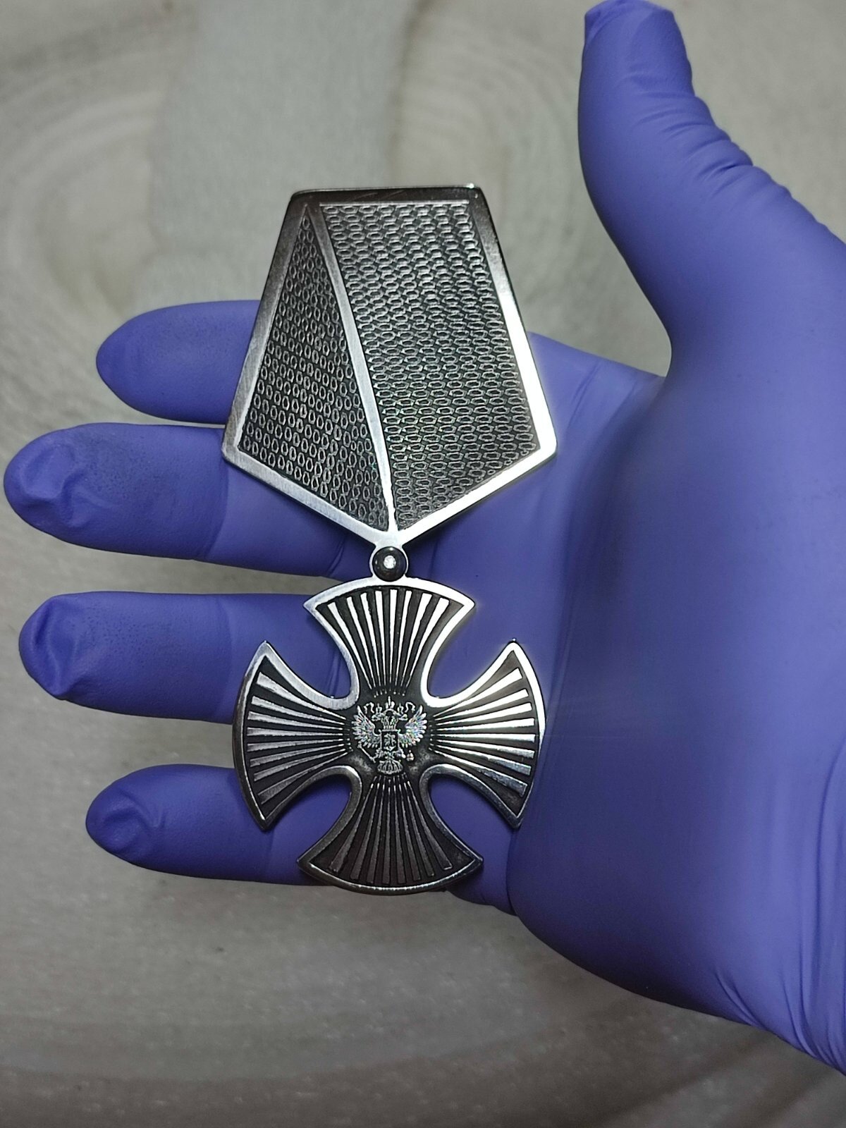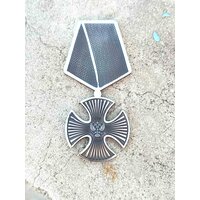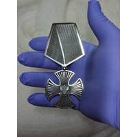 Фальш Орден "Мужества" для памятников, стендов, доски почёта, обелиска и памятных табличек. Орден изготовлен из нержавеющей стали. Серебристого цвета. Орденом "Мужества" награждаются граждане Российской Федерации, проявившие самоотверженность, мужество и отвагу при охране общественного порядка, в борьбе с преступностью, при спасении людей во время стихийных бедствий, пожаров, катастроф и других чрезвычайных обстоятельств, а также за смелые и решительные действия, совершенные при исполнении воинского, гражданского или служебного долга в условиях, сопряженных с риском для жизни. В соответствии со статутом допускается награждение орденом посмертно. Размер: высота 10 см, ширина 5 см, толщина 3 мм. Крепится на клей.