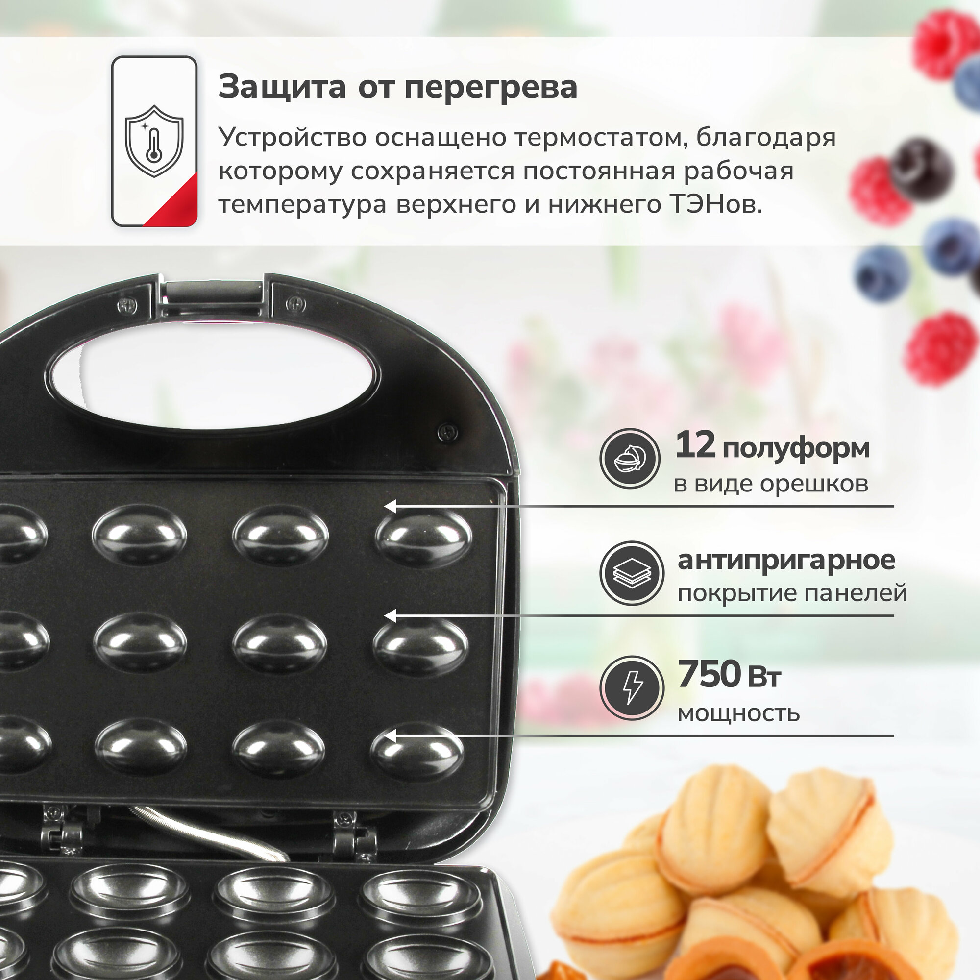 Орешница электрическая предназначена для приготовления вкуснейшего домашнего печенья "Орешки". Пластины орешницы быстро и равномерно нагреваются, антипригарное покрытие позволит избежать пригорания и обеспечит легкий уход за прибором. Орешница проста и удобна в применении, индикаторы включения и нагрева подскажут готовность прибора к работе. На такой орешнице вы сможете приготовить за один раз 6 целых орешков из 12 половинок. Наполнитель выбирайте на свой вкус: это может быть вареная сгущенка, варенье или джем, крем, шоколадная паста. Порадуйте своих родных и близких сладким лакомством, знакомым всем нам с детства.
