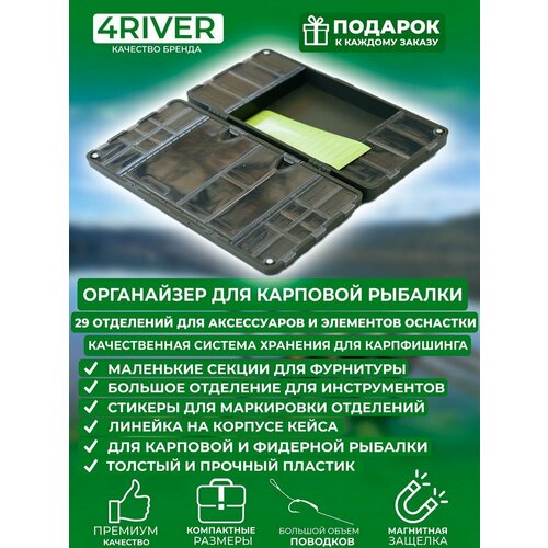 Органайзер карповый, для ловли карпа на бойлы, пеллетс и кукурузу. Изготовлен из прочного пластика, вмещает большое количество рыболовной фурнитуры. Имеет 28 отделений для элементов оснастки и одно большое для инструментов, ножниц, игл и поводкового материала. Применяется для рыбалки на карпа, амура и сазана с использованием карповых и методных снастей. Подойдет так же при ловле на фидер, жерлицы и поплавочную удочку. Отделения и секции предназначены для хранения крючков, вертлюгов, стопоров, конусов, бусин, клипс. Кейс оснащен удобными магнитными защелками. Совместим со многими другими аксессуарами и сумками карпфишинга. Размеры 23,5х12х3,5см. Подарок к каждому заказу