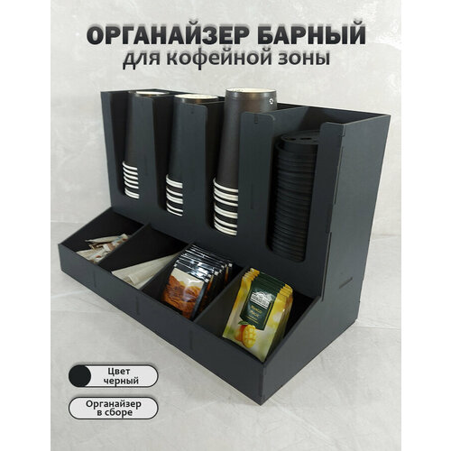 Органайзер имеет 4 отсека для стаканчиков и крышек и 4 отсека для сахара, сливок, мешалок и др.