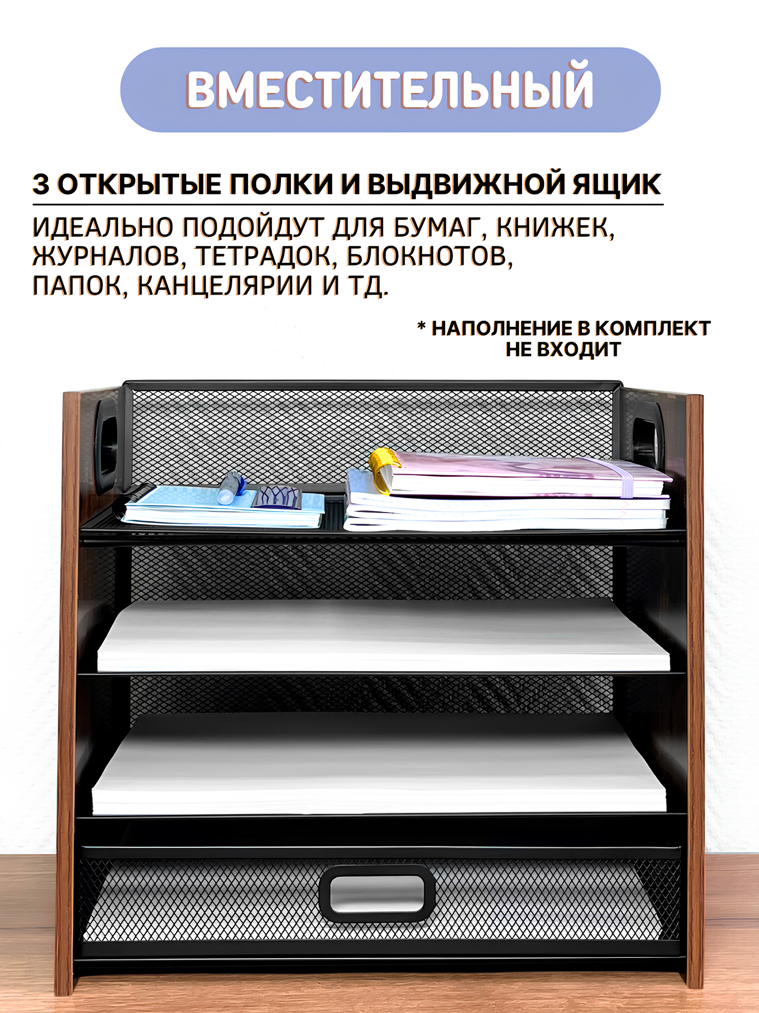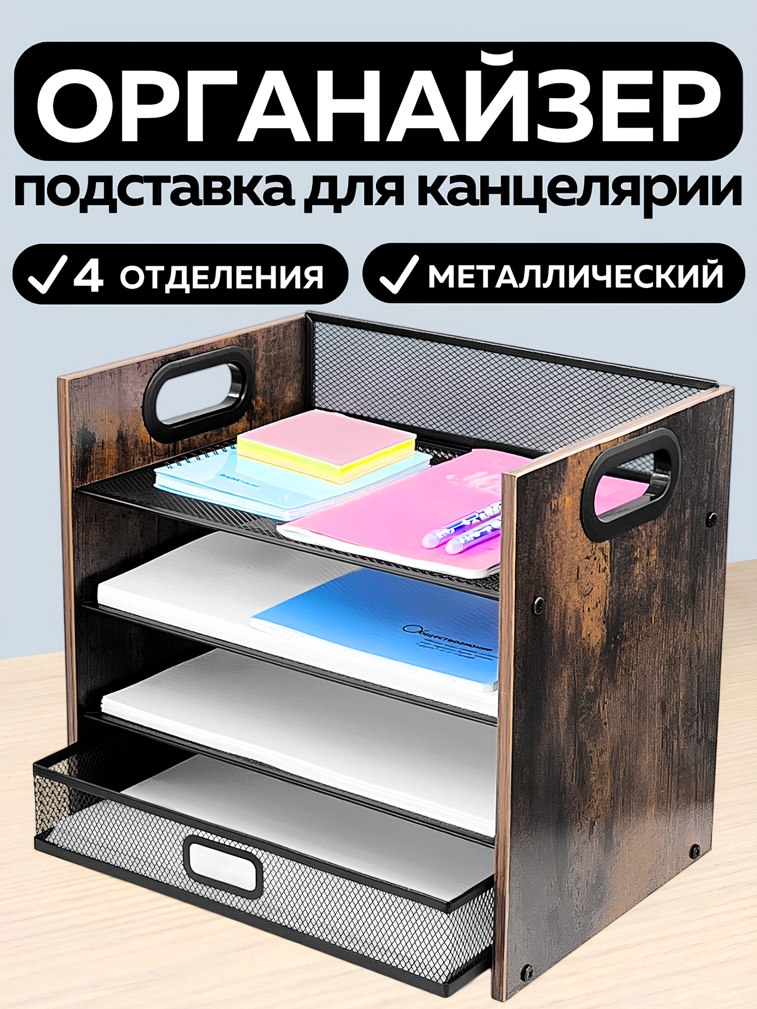 Металлическая подставка-органайзер предназначена для хранения различных бумаг, документов и папок. Органайзер для бумаг настольный прекрасно украсит рабочий или косметический стол как дома, так и на работе. Лоток для бумаги А4 горизонтальный изготовлен из металлической сетки, имеет 4 отделения. Органайзер для тетрадей и учебников выполнен в черном цвете. Качественная окраска.