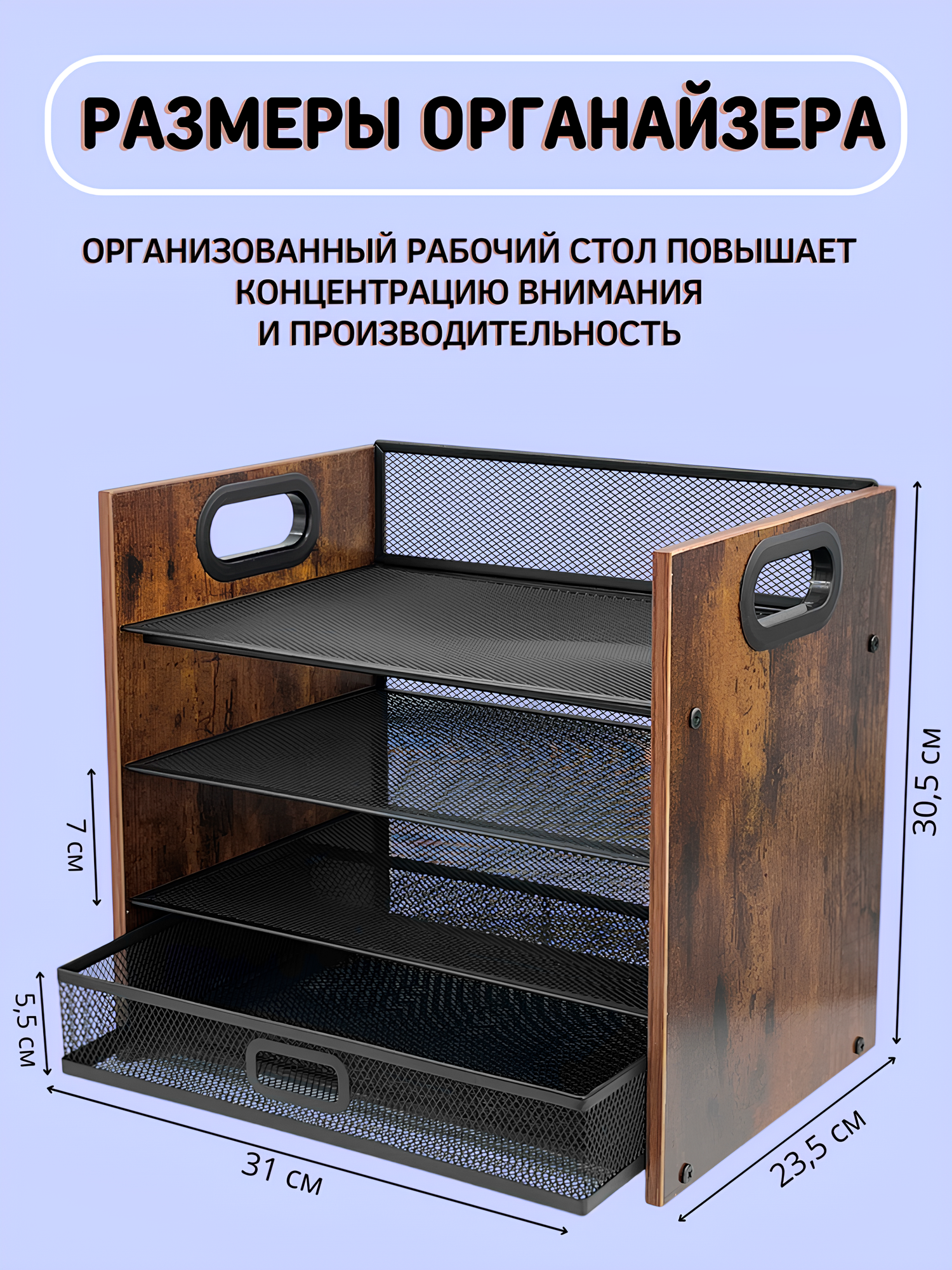 Органайзер для бумаг настольный металлический — незаменимый и стильный помощник для упорядочивания необходимых вещей, которые будут всегда под рукой. Сетчатый настольный контейнер для бумаг, каркас изготовлен из стальной проволочной сетки промышленной прочности и усилен прочной стальной рамой. Органайзер для учебников имеет 4 уровня хранения. Органайзер офисный поставляется без канцелярского наполнения. Конструкция ручки позволяет легко перемещать органайзер для документов на стол.