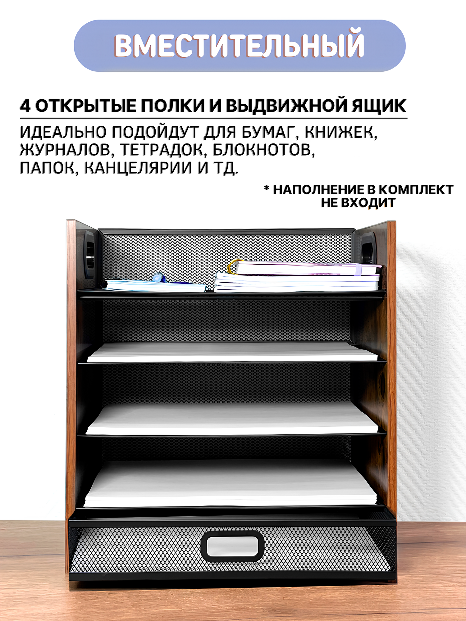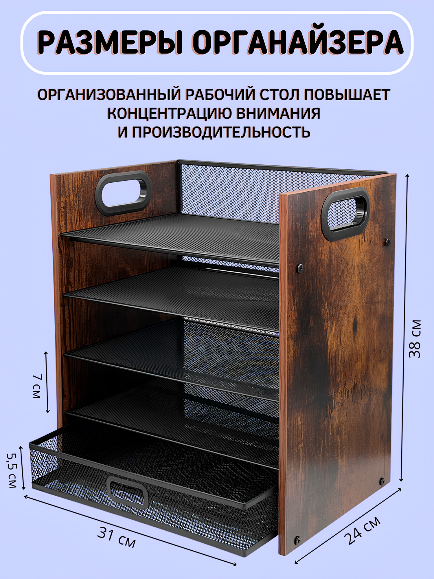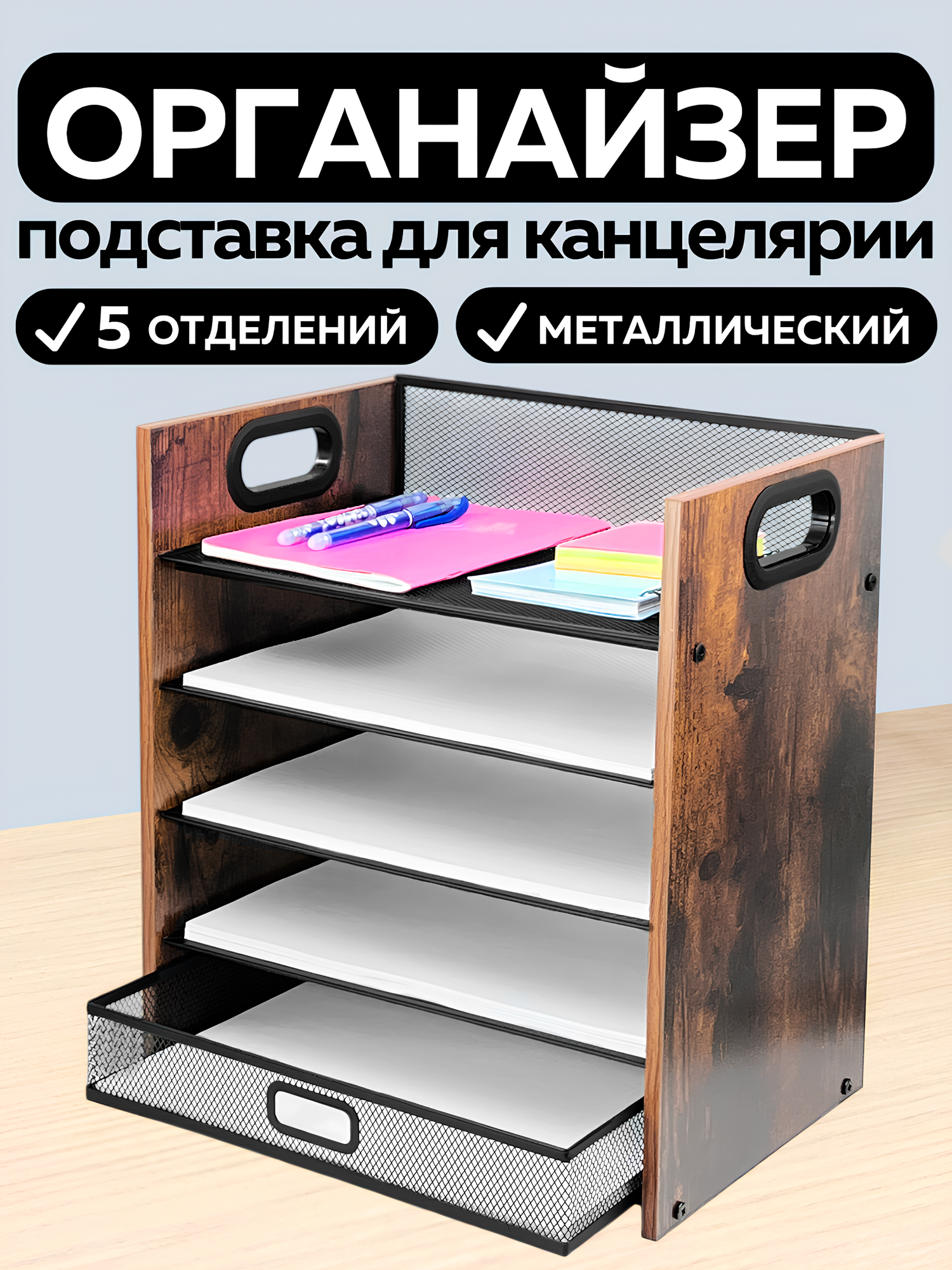 Органайзер для бумаг настольный металлический — незаменимый и стильный помощник для упорядочивания необходимых вещей, которые будут всегда под рукой. Сетчатый настольный контейнер для бумаг, каркас изготовлен из стальной проволочной сетки промышленной прочности и усилен прочной стальной рамой. Органайзер для учебников имеет 5 уровней хранения. Органайзер офисный поставляется без канцелярского наполнения. Конструкция ручки позволяет легко перемещать органайзер для документов на стол.