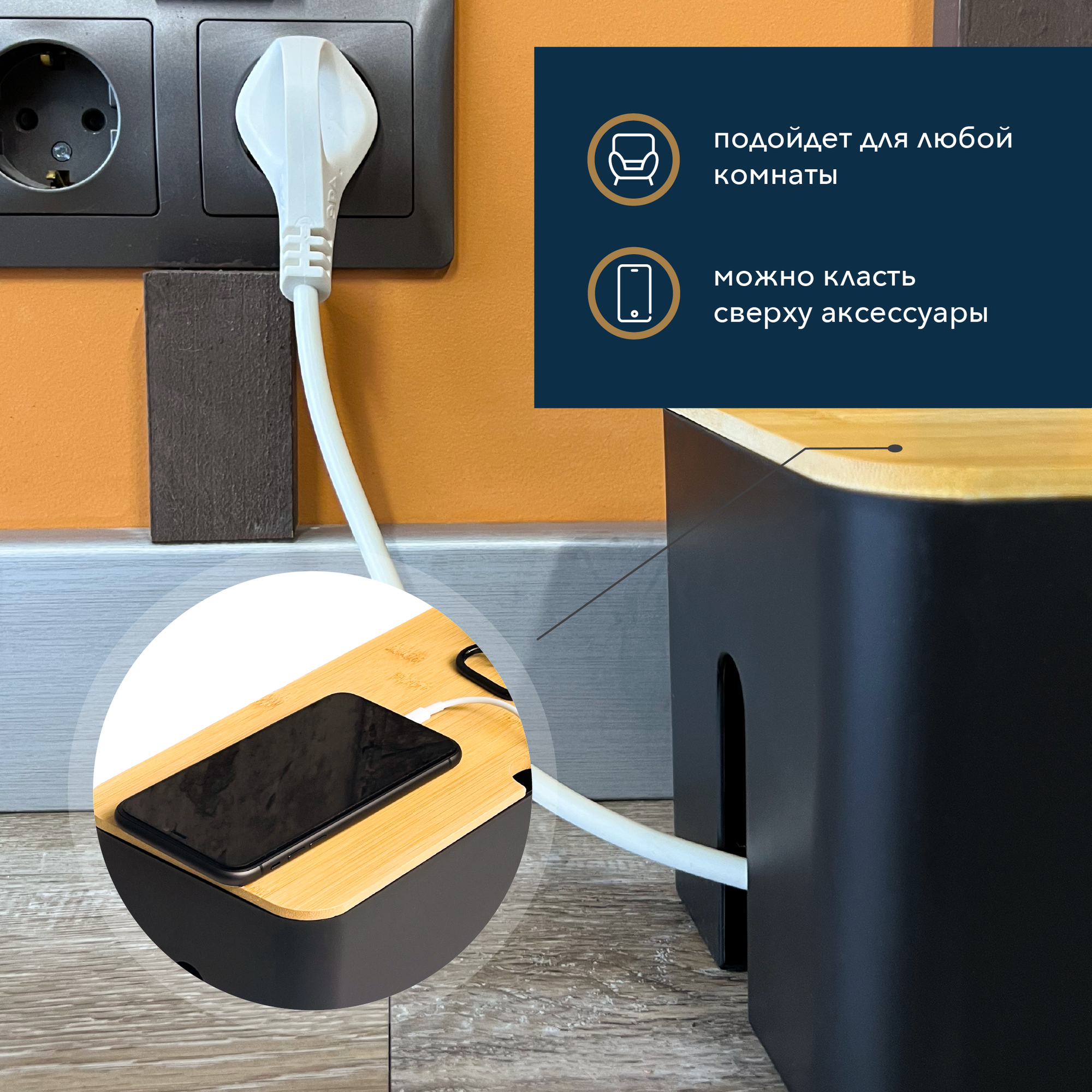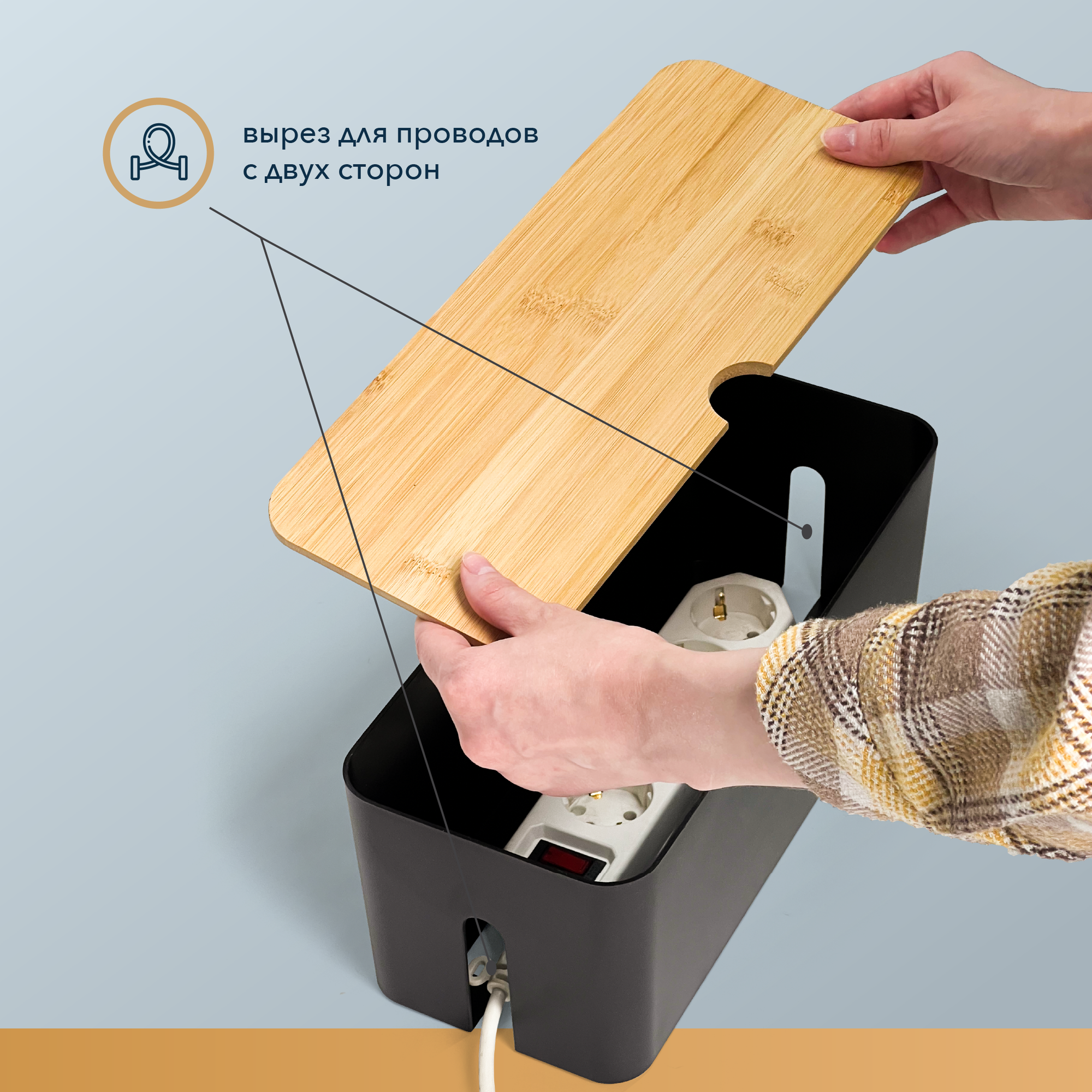 Органайзер для проводов – лучшее решение для дома и офиса. Он поможет аккуратно убрать провода, чтобы они не болтались под ногами и не портили общий вид в комнате. Наш держатель подходит для зарядок, сетевых фильтров и удлинителей не более 28 см. Размеры: 13 x 13,5 x 32 см. Корпус выполнен из пластика, на котором не остается отпечатков пальцев. Крышка сделана из качественного бамбука. На крышке есть дополнительное место для хранения роутера или полезных мелочей. Благодаря универсальному оттенку коробка впишется в любое помещение и придаст уют дому или офису. Его можно поставить под стол в спальню, гостиную, детскую, рабочий кабинет или на кухню — любую комнату, где нужно спрятать провода. Ящик защитит их от влаги и пыли, облегчит уборку и улучшит общий вид интерьера. С хранением проводов в контейнере больше не надо тратить огромное количество времени на протирание каждого провода по отдельности. Он надежно защищает маленьких детей и животных от включенных электроприборов. С обеих сторон короба есть отверстия для удобного вывода проводов. К тому же, эти отверстия помогают воздуху не задерживаться внутри и циркулировать предотвращая перегорание электрических элементов. Наш бокс – это отличная защита электроники от заломов, так как провода меньше будут перегибаться и не будут мешать на полу или столе. Маскировка проводов с помощью нашего органайзера — это стильно, аккуратно и безопасно.